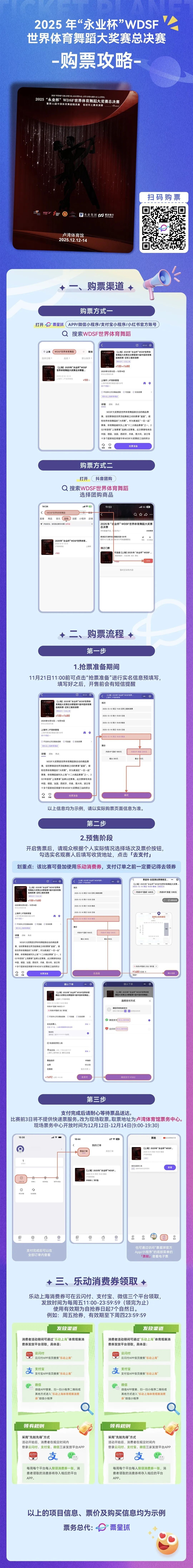 小体温馨提示,本次大赛已成功纳入“乐动上海”体育消费券适用赛事范围哦。观众在通过官方指定渠道购票时,可按规则直接抵扣相应票款。赶快锁定心仪座席,在享受世界顶级舞蹈盛宴的同时,也为你的观演体验增添一份实惠与惊喜。