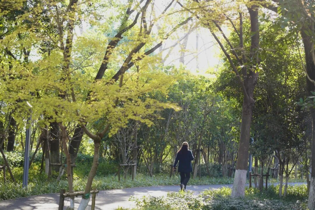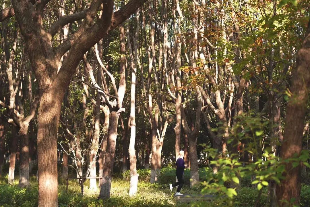 在喧嚣的城市边缘,藏着一处静谧的“童话森林”——泗沙林地公园,位于徐泾镇金联村,紧邻大型居住区明珠家园。晨光熹微,不绝于耳的鸟鸣轻轻唤醒这片林地,仿佛大自然自带的闹钟。阳光穿过疏疏落落的枝桠,洒下斑驳光影,悄悄染红了枫叶,点亮了林间每一个角落。沿着蜿蜒的健身步道缓缓而行,脚下是沙沙作响的落叶,身边是轻轻摇曳的树影,偶有晨练的人擦肩而过,一切都显得如此安宁而从容,这里不仅是呼吸自然的好去处,更是心灵放松的栖息地。