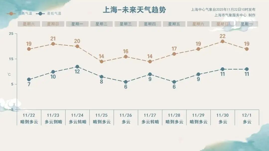 受辐射降温影响,昨夜今晨(11月22日)西部和北部郊区出现能见度低于500米的雾,其中宝山、青浦、闵行、崇明的个别站点能见度不足200米。今日早间气温起步也不算高,市区徐家汇在7℃多,郊区大多在1~5℃之间。阳光登场之后,雾气快速消散,白天天气以晴到多云为主,气温比昨日再上一个台阶,日最高气温升至19℃。