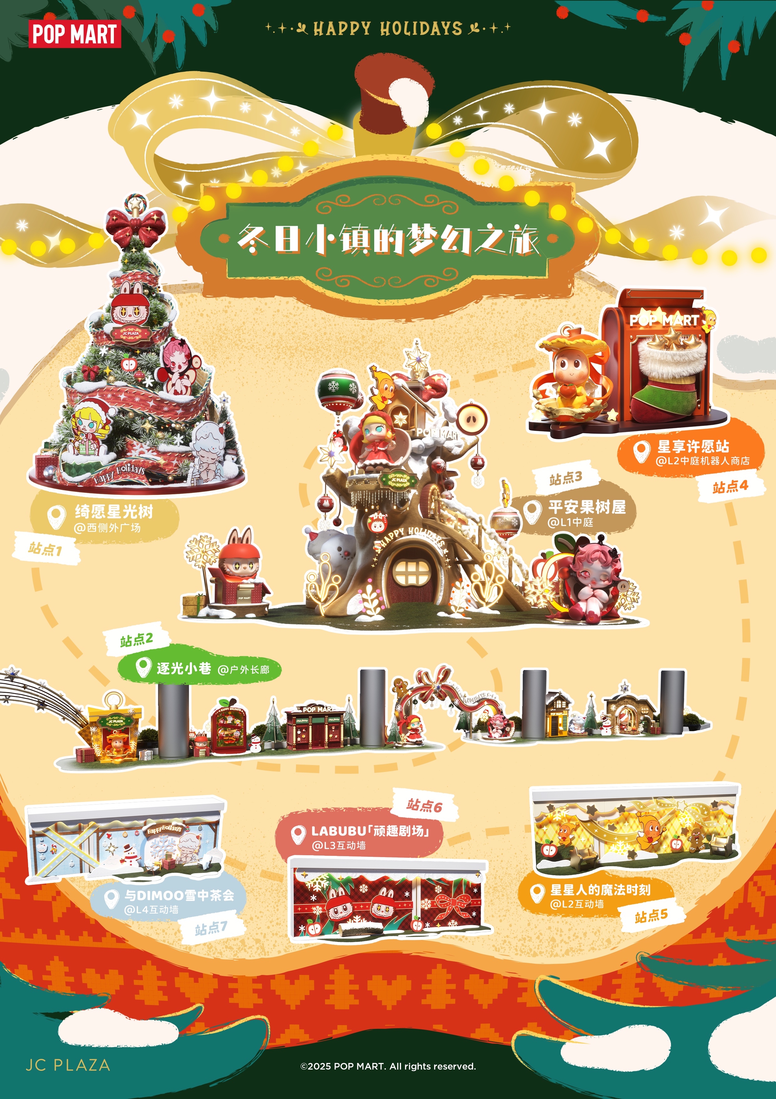 西侧外广场入口的“绮愿星光树”装置,以礼物缎带、泡泡玛特可爱小伙伴们层层环绕,满树皆是小小惊喜。从这里踏入JC冬日星光绮旅,开启一段充满欢乐与美好的冬日旅途。