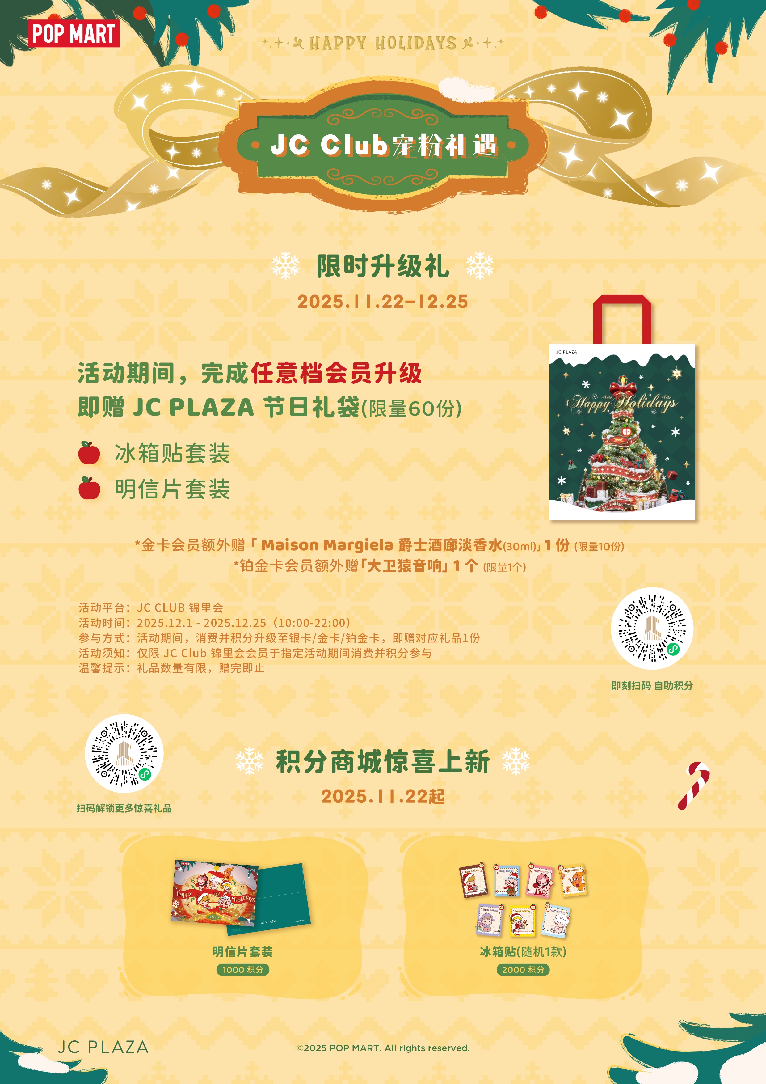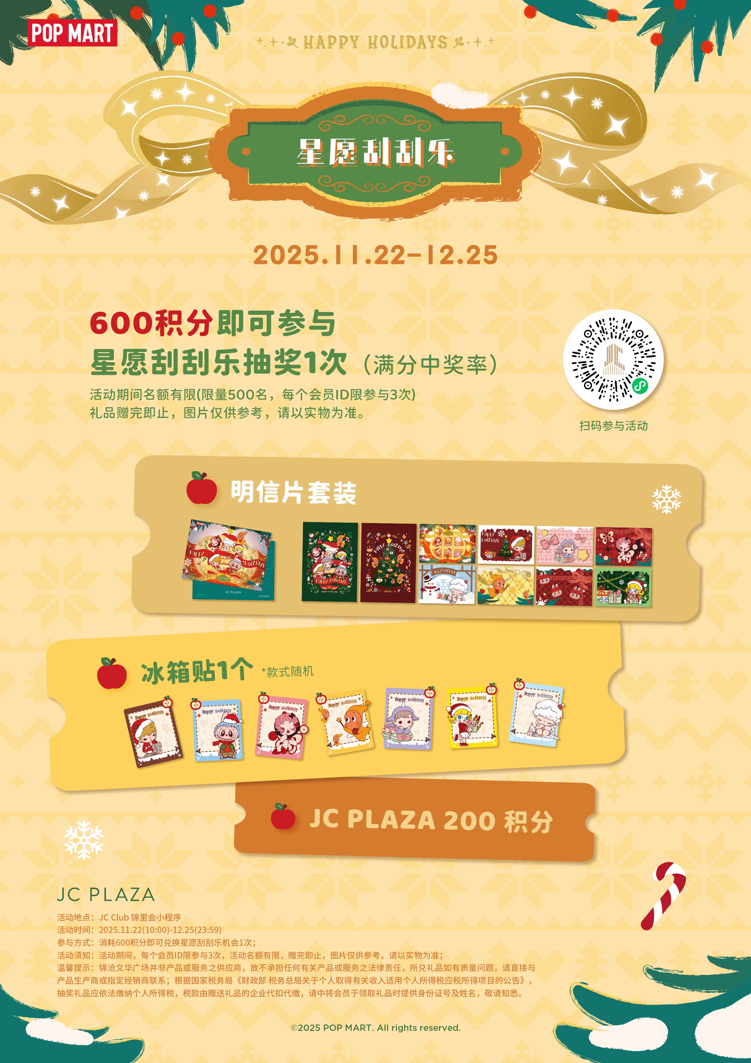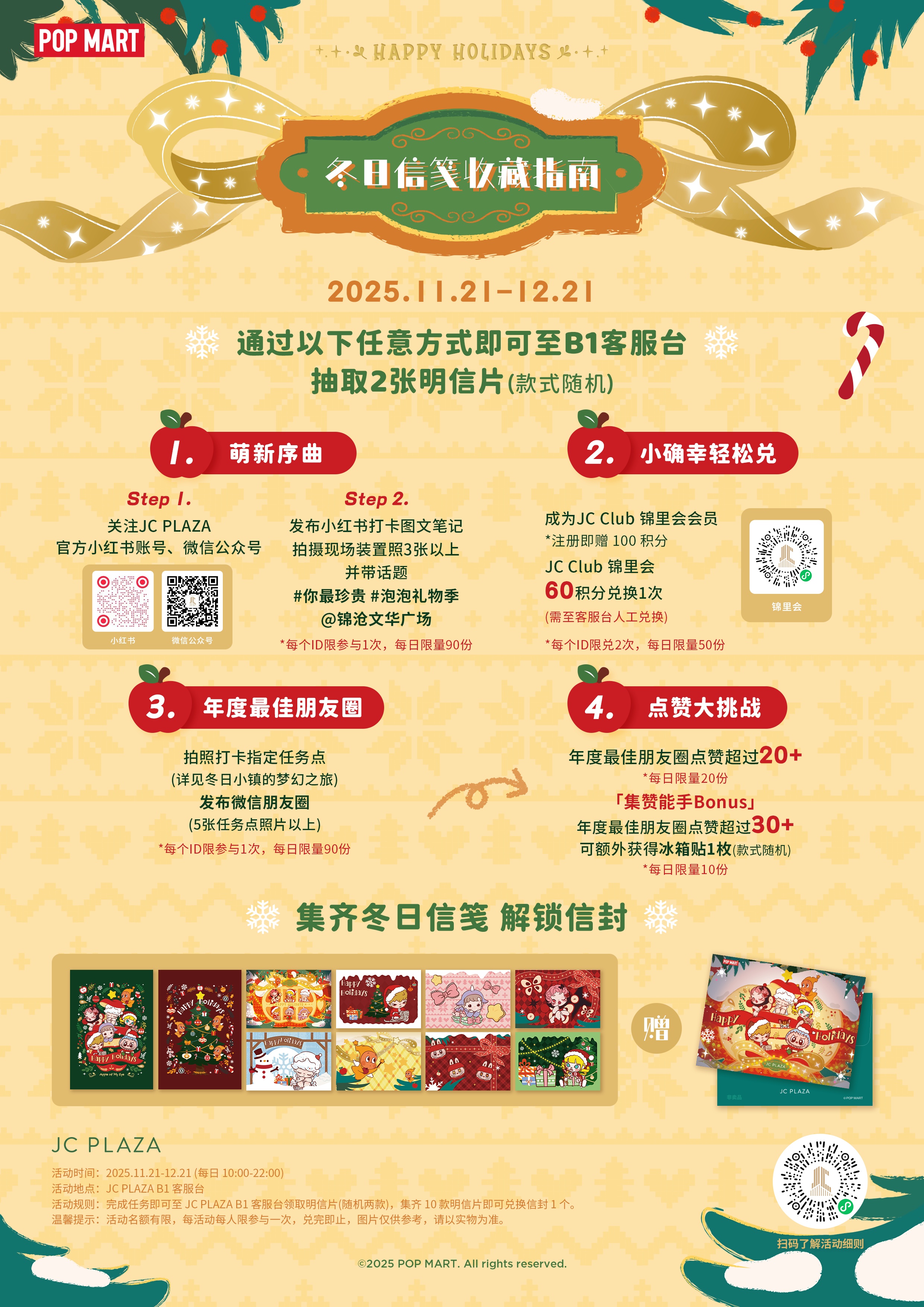 在七大点位的基础上,JC PLAZA还推出“玩家彩蛋”与“会员彩蛋”等互动玩法:消费者可通过拍照打卡、任务体验等方式获得精美周边:明信片、冰箱贴与礼袋等,打造线上与线下的多维联动,让消费者在体验场景时,深度参与互动、沉浸氛围,从而构成一个更完整、更具参与感的体验链路。