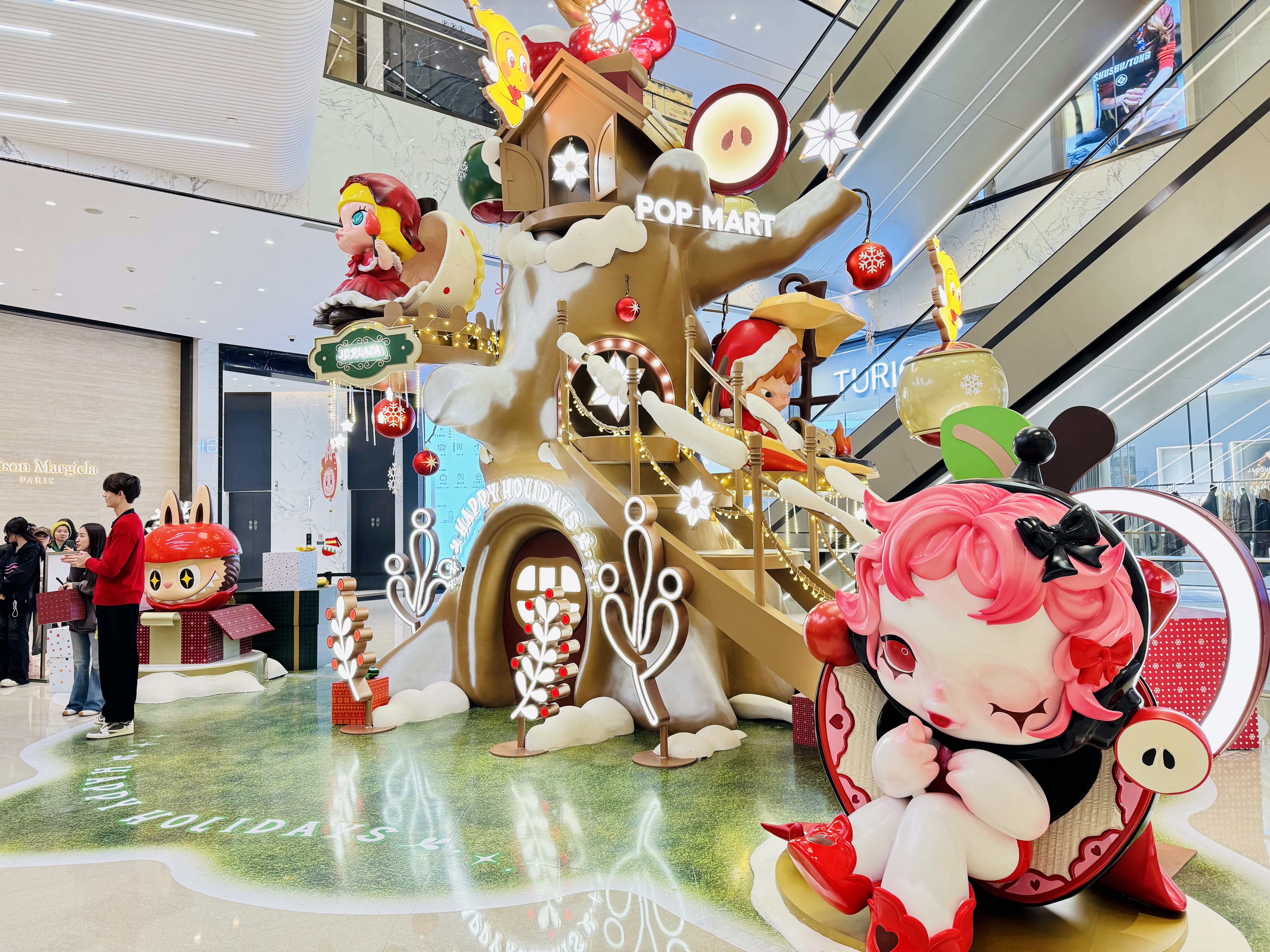 室内L1中庭的“平安果树屋”如同童话里出现的小小心愿木屋,在泡泡玛特小伙伴们的陪伴下,整个场景都透着柔软梦幻的氛围;