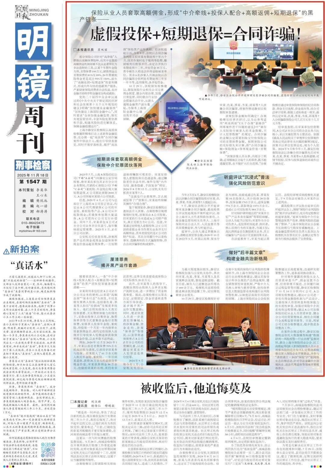 在案件办理过程中,静安区检察院还依托大数据模型构建“数据研判—风险预警—行业治理”监督闭环,联合上海市保险同业公会、区工商联起草《新入职保险销售人员从业刑事风险防范告知书》,定期选派检察官深入保险企业开展普法,并参与“清朗浦江·2025”保险“沪”航网络生态治理活动,针对非法金融中介违规执业、违法代理退保等领域开展精准普法。