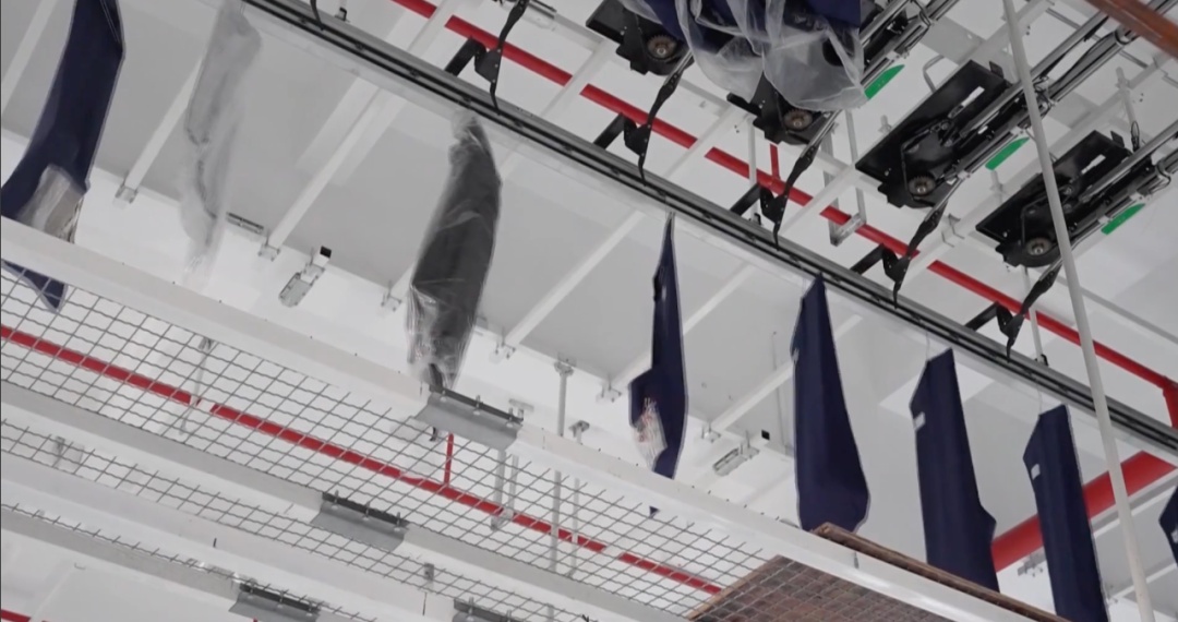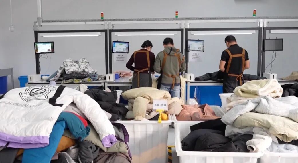 工厂内,每件衣物通过专属RFID芯片识别后,被精准分流至不同洗护工位。一旁的电子屏实时跳动着衣物编号、面料类型与目标位置,洗涤、熨烫、分拣全流程可追踪。其中,高空烘房成为羽绒服洗护的关键环节。范昭形象地描述:“羽绒服先经高空烘房进行首遍干燥,再进入烘干机,最终羽绒状态饱满,就好像刚出炉的面包,蓬松柔软。”这一细节吸引了众多消费者下单体验。