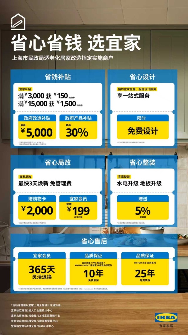 持续聚焦“适老化”议题,宜家上海近期推出的“政企双补”政策与一站式整装服务,二者形成合力,从政策支持到服务落地,为消费者构建起省心省钱的一站式家居解决方案。