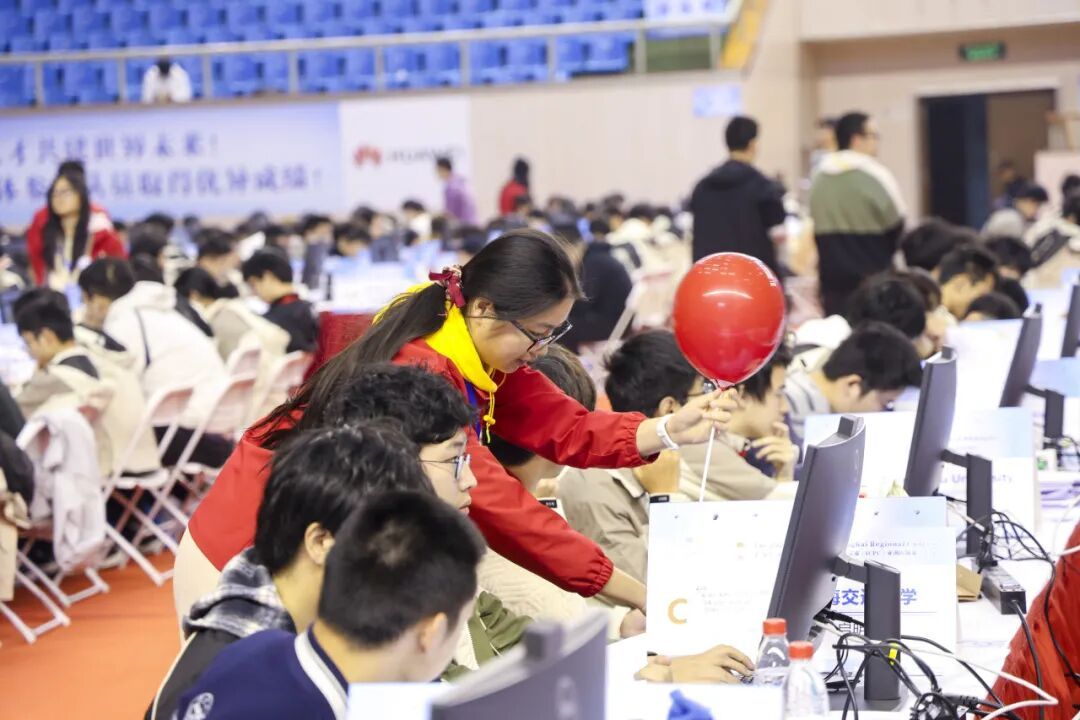 大屏幕上的榜单实时更新,赛场气氛紧张而热烈。志愿者们穿梭不息,及时为成功解题的队伍送上对应颜色的气球,这些跃动的色彩不仅装点了赛场,更见证着每一次突破。5小时内,356支队伍进行了4638次提交。