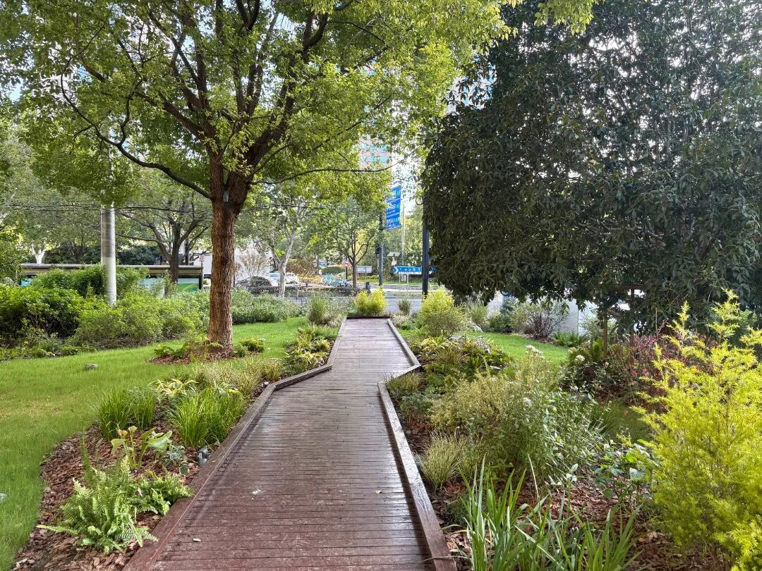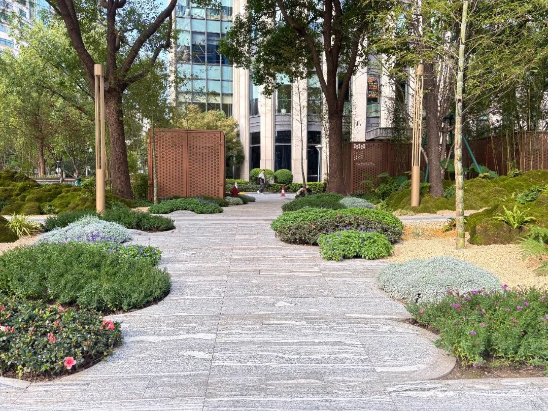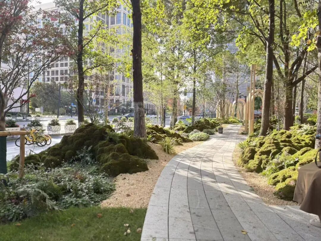 连接各景点的游园步道也自成风景。步道两侧的绿地内保留了香樟、银杏等原生植被,新增龟甲竹、红枫、红粉佳人樱等特色植物,搭配苔藓微景观,在都市中再现“苔痕上阶绿,草色入帘青”的自然意趣。