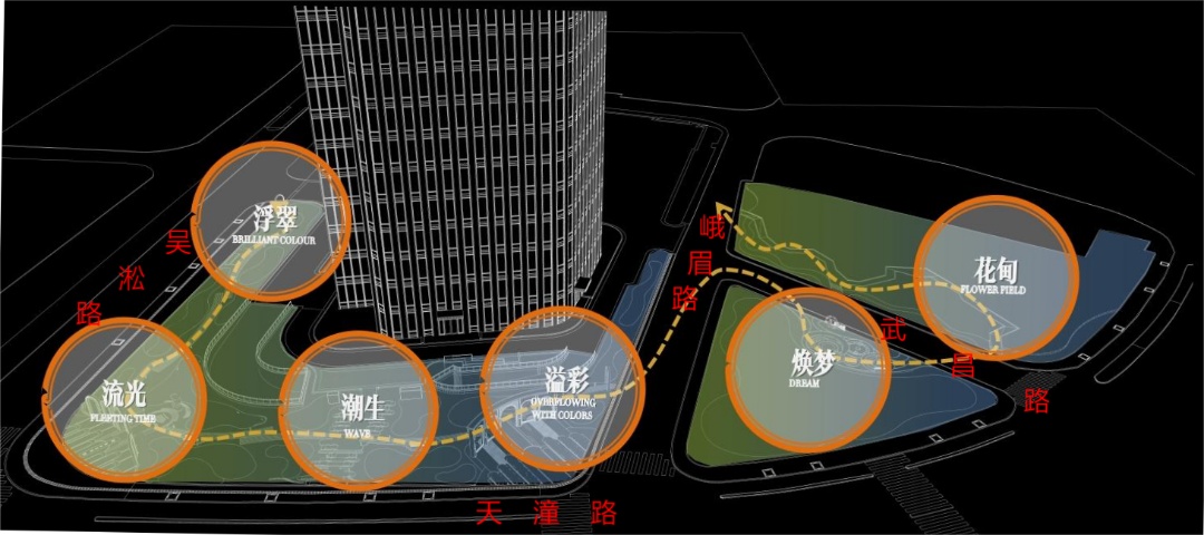 公园设计以“时光流转”为线索,巧妙布局流光、溢彩、潮生、浮翠、焕梦(鎏金乐园)、花甸六大景点,让每一步都能邂逅不同的风景。