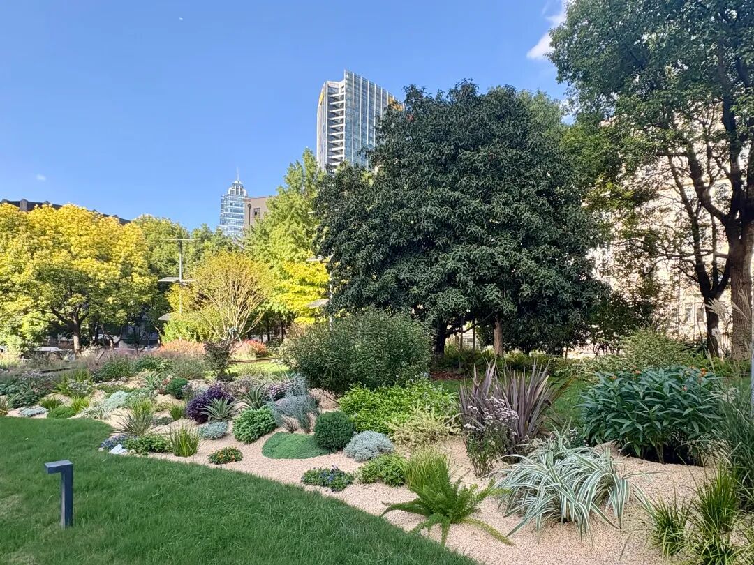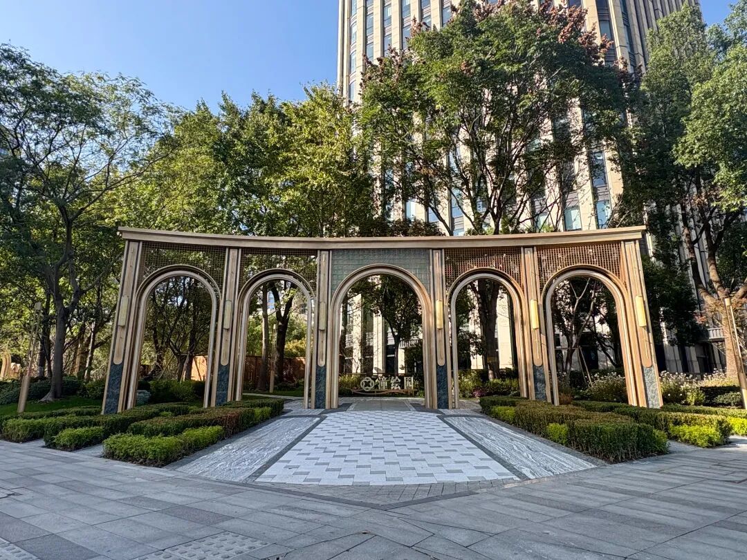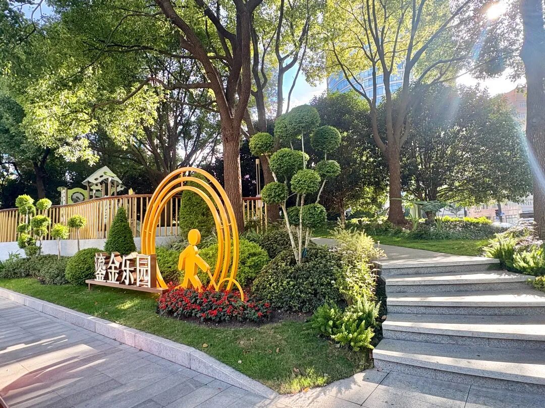 天潼路吴淞路口袋公园,以“岁月鎏金、臻世繁花”为主题,整合公共绿地与附属绿地空间,改造总面积达6297平方米。