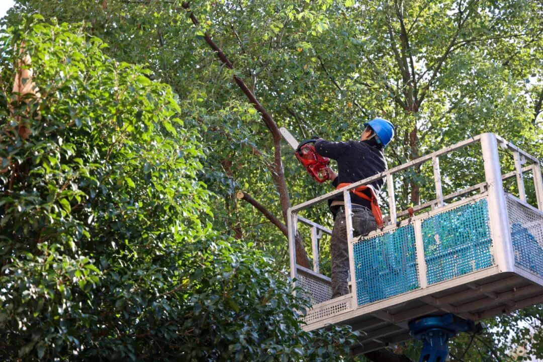 在金来苑小区,工作人员正手持专业工具,对小区内的高大树木进行回缩修剪。据工作人员介绍,由于小区部分树木生长过旺、树干高大,不仅严重影响低层居民的采光,大风天气还可能导致枯枝坠落,存在不小的安全隐患。