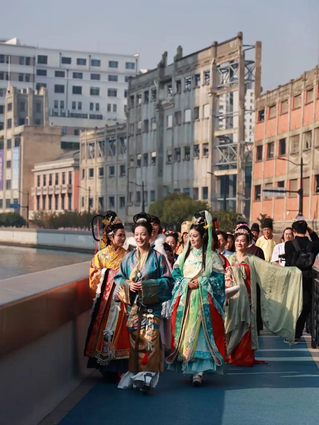 队伍行经中国银行办事所旧址、怡和打包厂、慎余里建筑群等历史景观时,不时驻足凝望。有人轻抚石库门墙上的纹路,有人倚在浙江路桥栏边眺望河景。汉服的典雅形制与百年建筑的沧桑风貌相映成趣,宛如一幅徐徐展开的时光长卷。