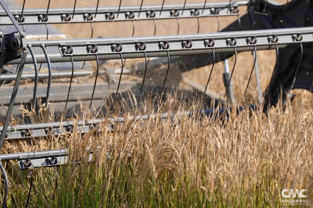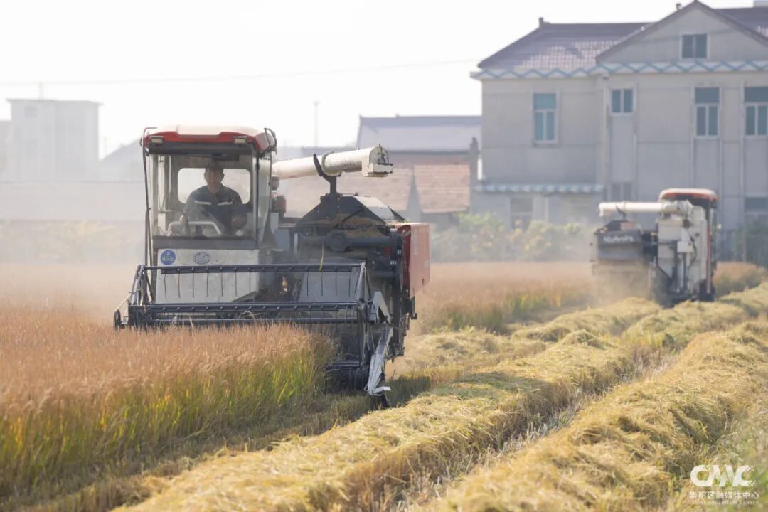 在新村乡上海聚霞粮食种植专业合作社的基地里,金黄的稻田一望无际,饱满的稻穗压弯了腰。农机手驾驶着收割机在田地间来回穿梭,一茬茬稻穗被整齐地“收入囊中”。割稻、脱粒、吐秆等工序一气呵成,空气中弥漫着沁人心脾的稻香。