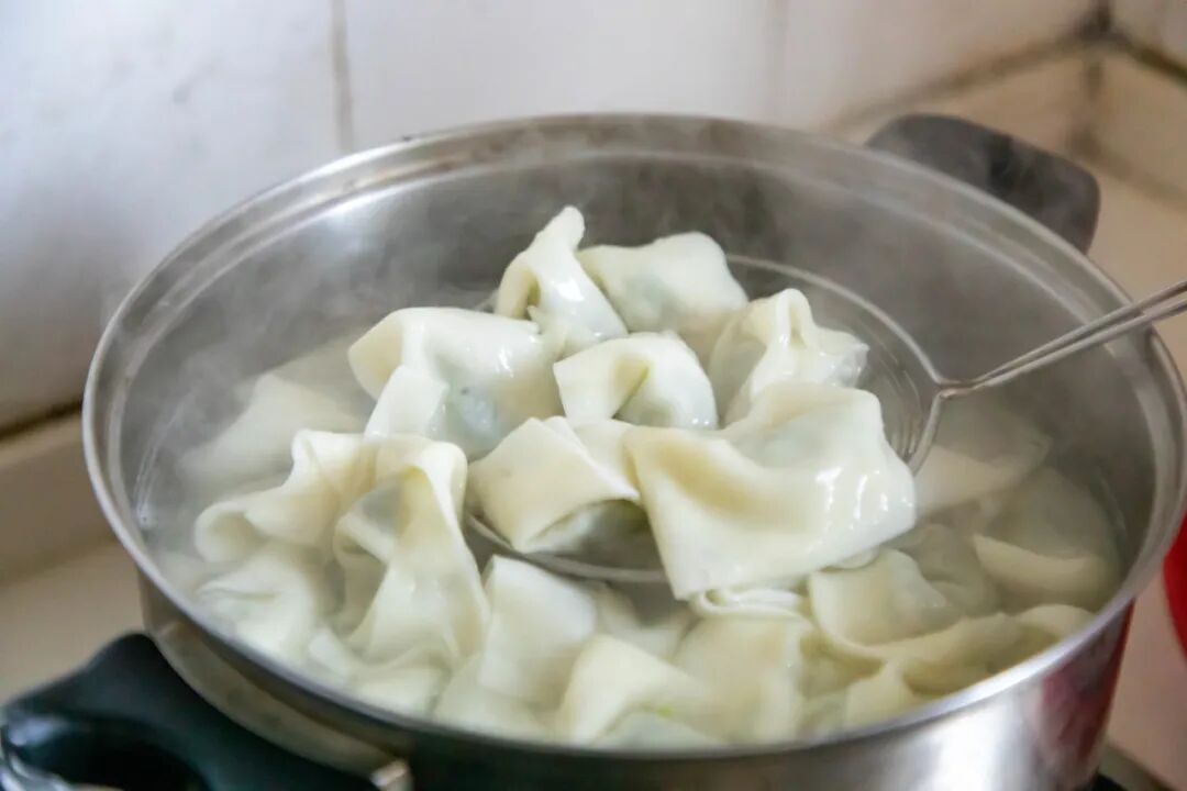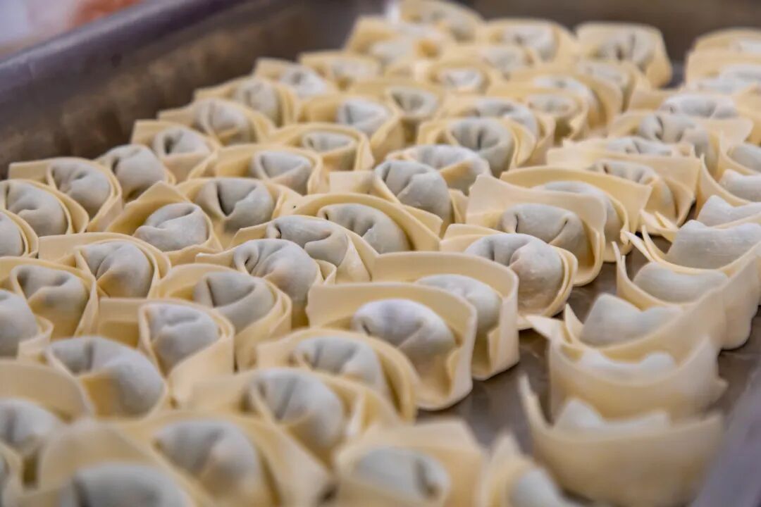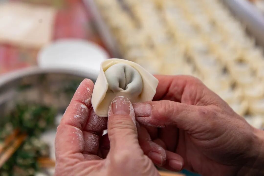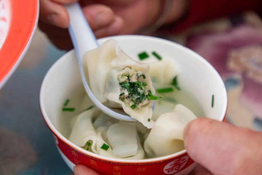 包馄饨的手法也很有讲究,馄饨皮摊在掌心,舀一勺馅放在中间,用手指在皮的边缘抹一圈清水,对折成半月形,再把两角交叉捏紧,一个饱满的元宝馄饨就成了。托盘上的馄饨排得整整齐齐,像一群等待检阅的小元宝……