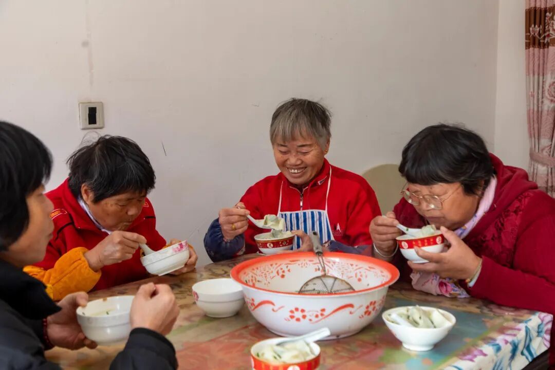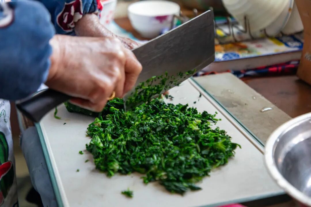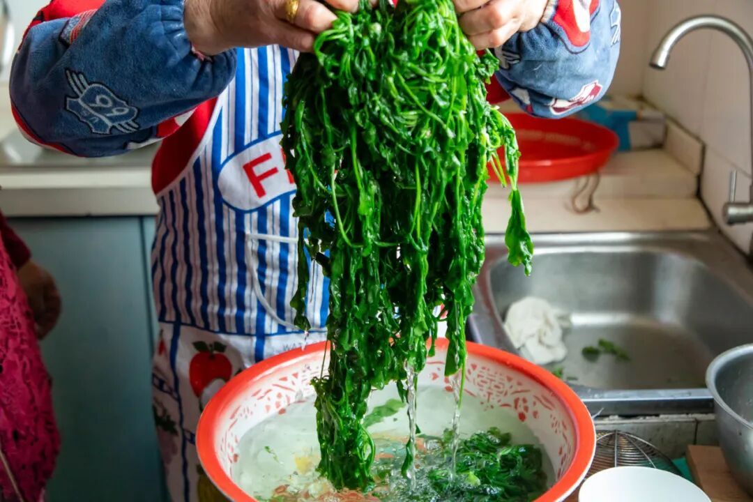 回到自家小院,阿嬢将荠菜去根洗净就可以准备焯水了。沸水锅里撒半勺盐、淋几滴菜籽油,荠菜下锅焯十五秒立刻捞出过凉水,这样能保住最鲜亮的绿色。挤干水分的荠菜在案板上切碎,刀刃与木板碰撞出轻快的节奏,像极了电影里老汪独自包馄饨时的那份专注,重复的动作里,藏着与生活和解的耐心。