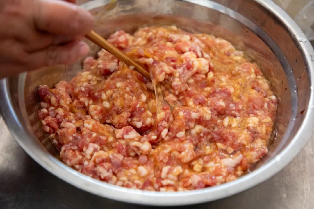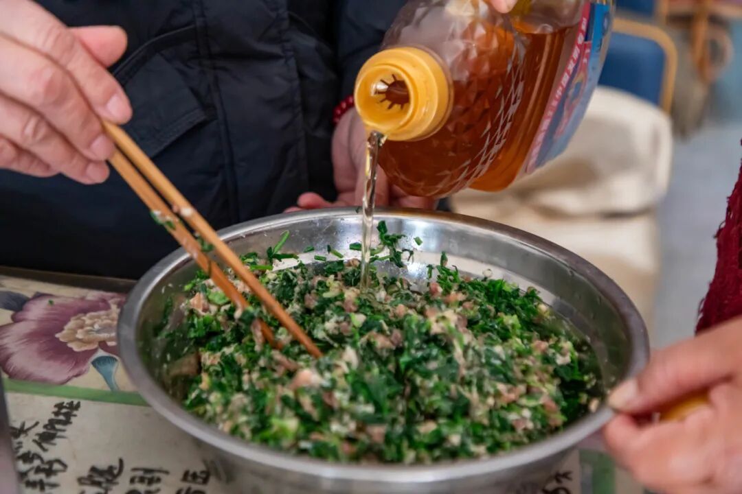 拌馄饨馅可是钱阿嬢的拿手好活。三分肥七分瘦的梅花肉剁成泥,加料酒、生抽、少许糖顺时针搅匀,再打一个土鸡蛋继续拌到发黏。“这样肉馅煮出来有弹性,咬着有汁。”她说着将荠菜末加进去,淋一勺香油拌匀,馄饨馅就完成了。