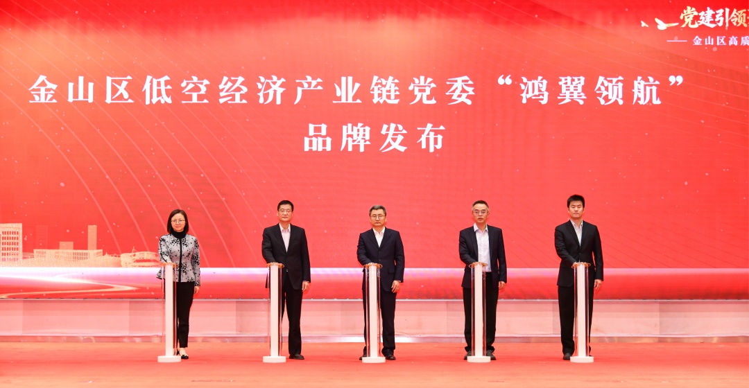 同期发布的金山区低空经济产业链“鸿翼领航”品牌,寓意以党建领航,以市场与服务为双翼,汇聚产业合力,推动金山区低空经济振翅高飞。