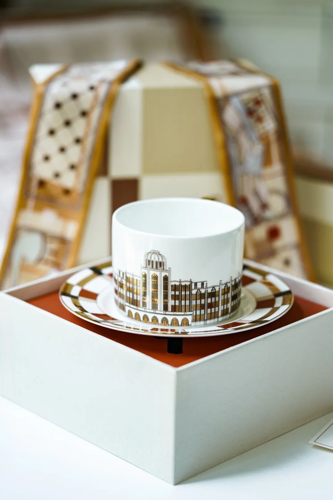 咖啡杯碟套装以骨瓷为材质,杯身印刻雷士德工学院建筑立面,杯碟衬以复古花窗格纹,品饮时仿佛将百年建筑的光影置于掌心。
