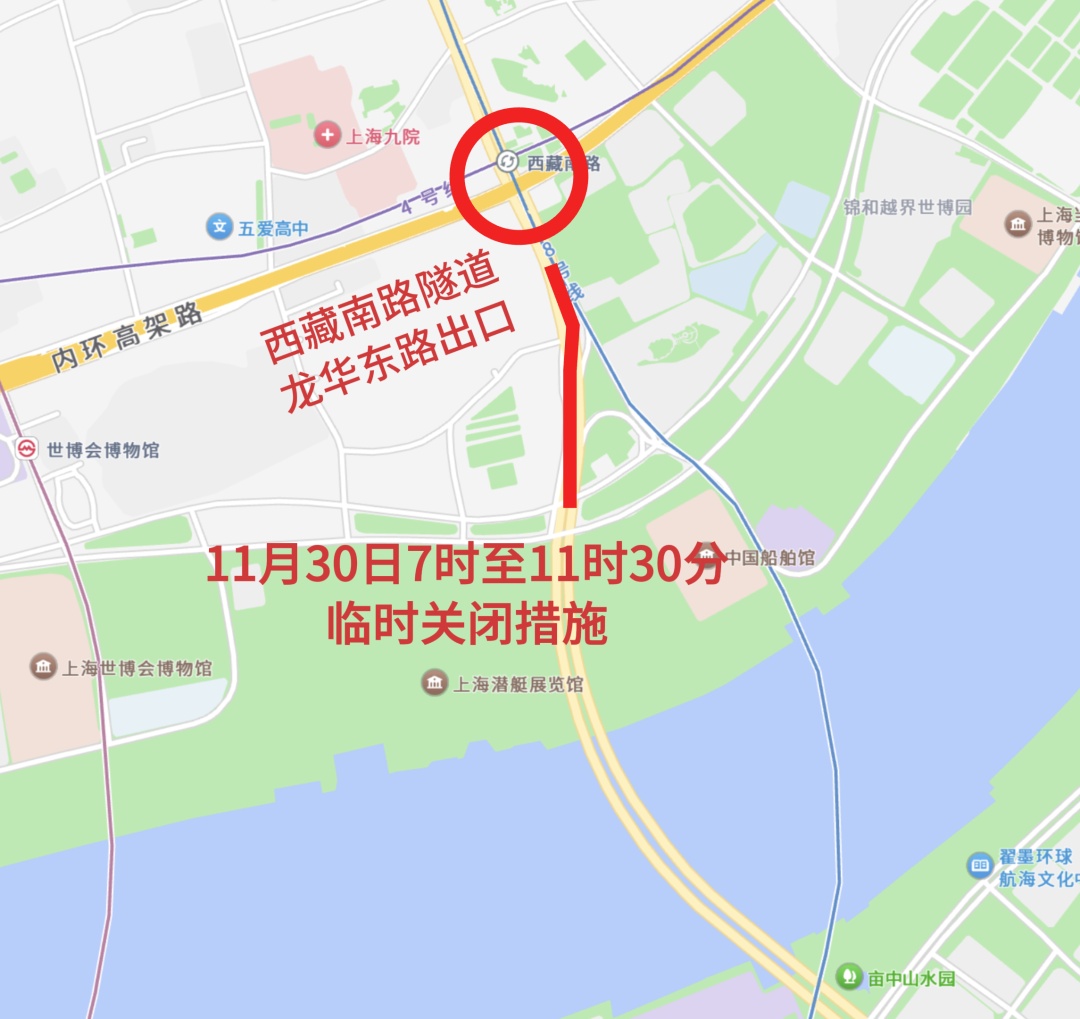 八、2025年11月30日7时至11时30分,西藏南路隧道龙华东路出口实施临时关闭措施。