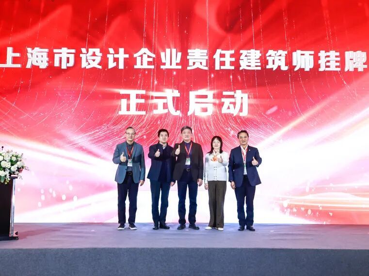 致辞结束后,马燕处长与上海市建设工程勘察设计管理事务中心主任顾秀平、常青理事长、常务副理事长张俊杰、学会党工组组长沈立东共同登台,携手启动“上海市设计企业责任建筑师挂牌”仪式,标志着相关工作正式拉开序幕。