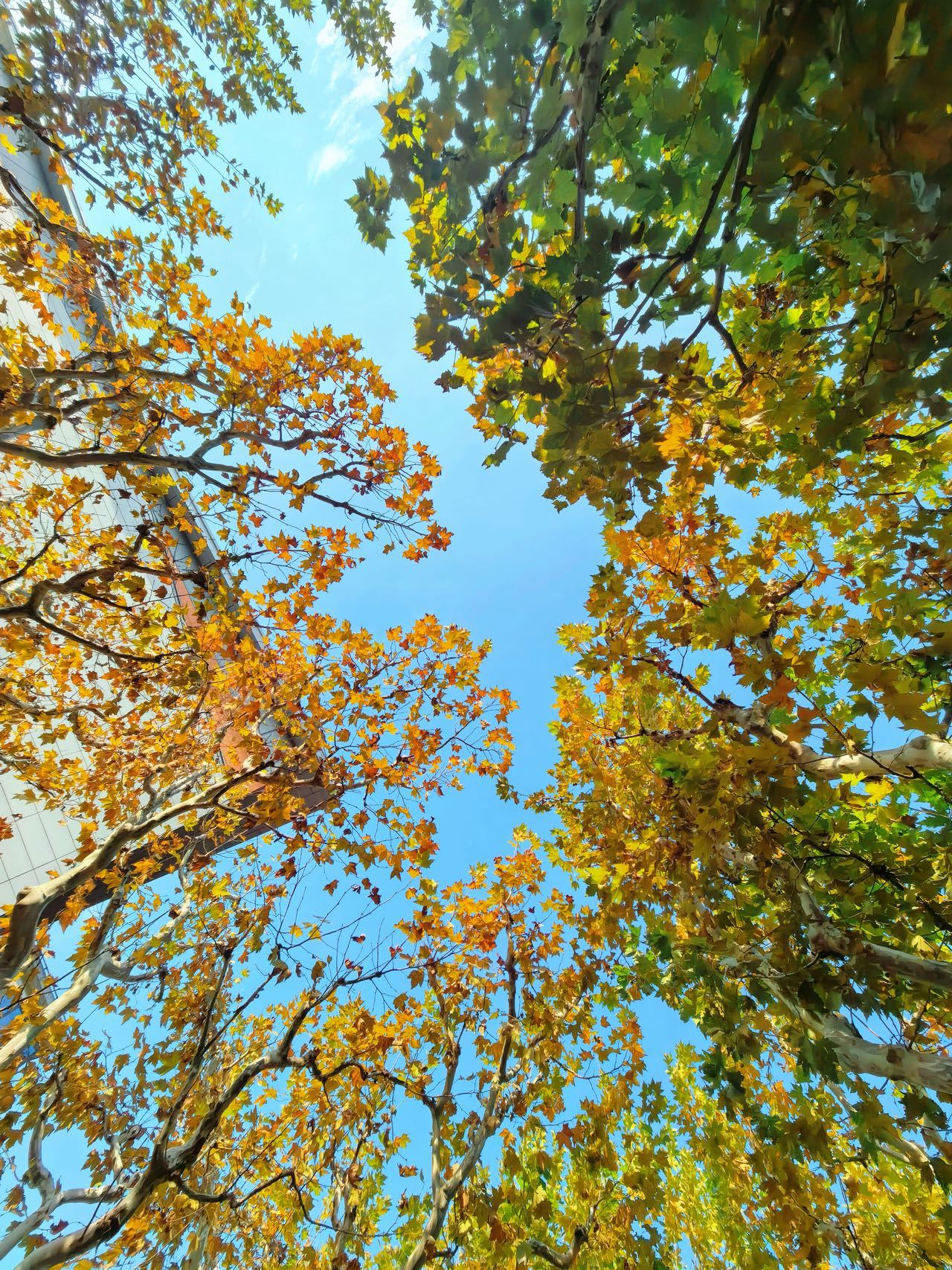 一树三色,红、橙、黄渐变,像被晚霞吻过,树干挺拔,宛如秋日里的“调色盘”。