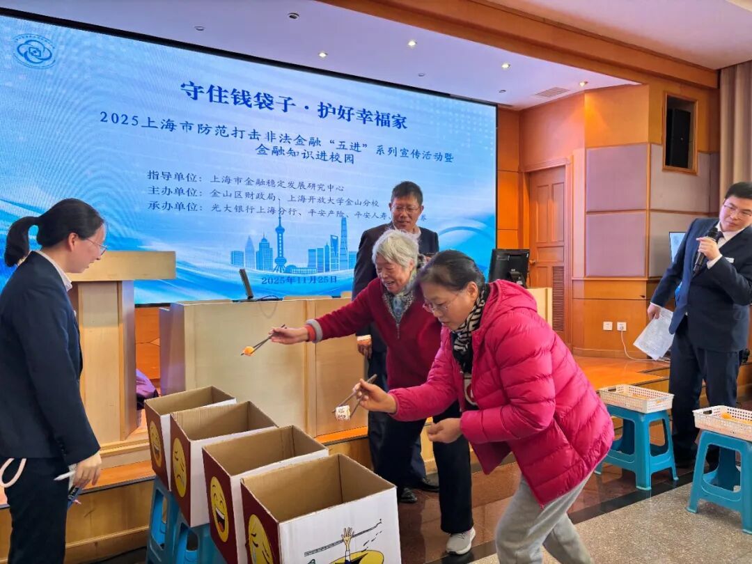 “既学到了防骗硬本领,又享受到了贴心健康检查,这样的课堂太实用、太暖心了!” 11月25日,由上海市金融稳定发展研究中心指导,金山区财政局、上海开放大学金山分校联合主办,光大银行上海分行、平安产险、平安人寿、华金证券共同承办的上海市防范非法金融“五进”系列之“金融知识进校园”宣传活动走进上海开放大学金山分校,将金融风险防范知识融入老年教育场景,为老年群体“钱袋子”筑牢防护墙。本次活动设置了一系列互动环节,百余位“银发学员”重返课堂,沉浸式体验了一堂别开生面的金融安全互动教学。