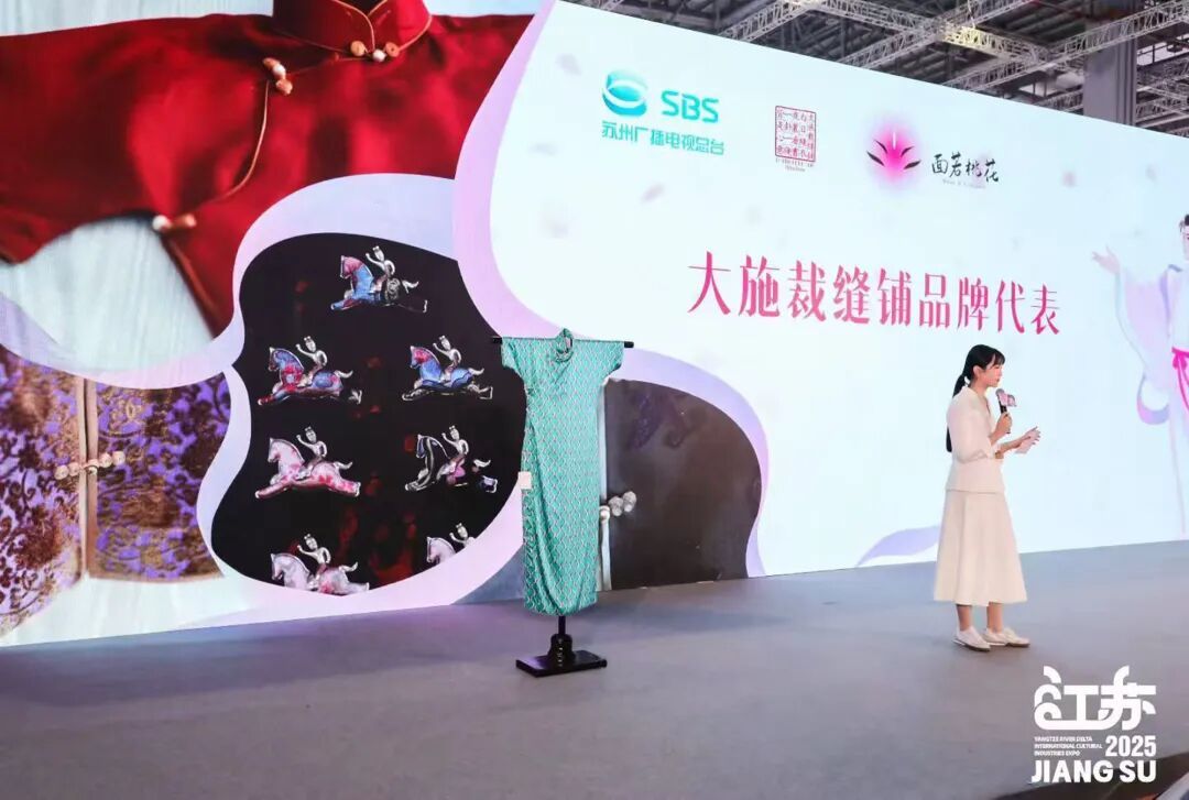 一直马不停蹄走在创新路上的施意。她参与设计的胸针、笔记本、挂件和定制旗袍多次被拿到国外展出。在刚刚落幕的长三角文博会上她还代表江苏对大众宣讲自己的品牌理念。