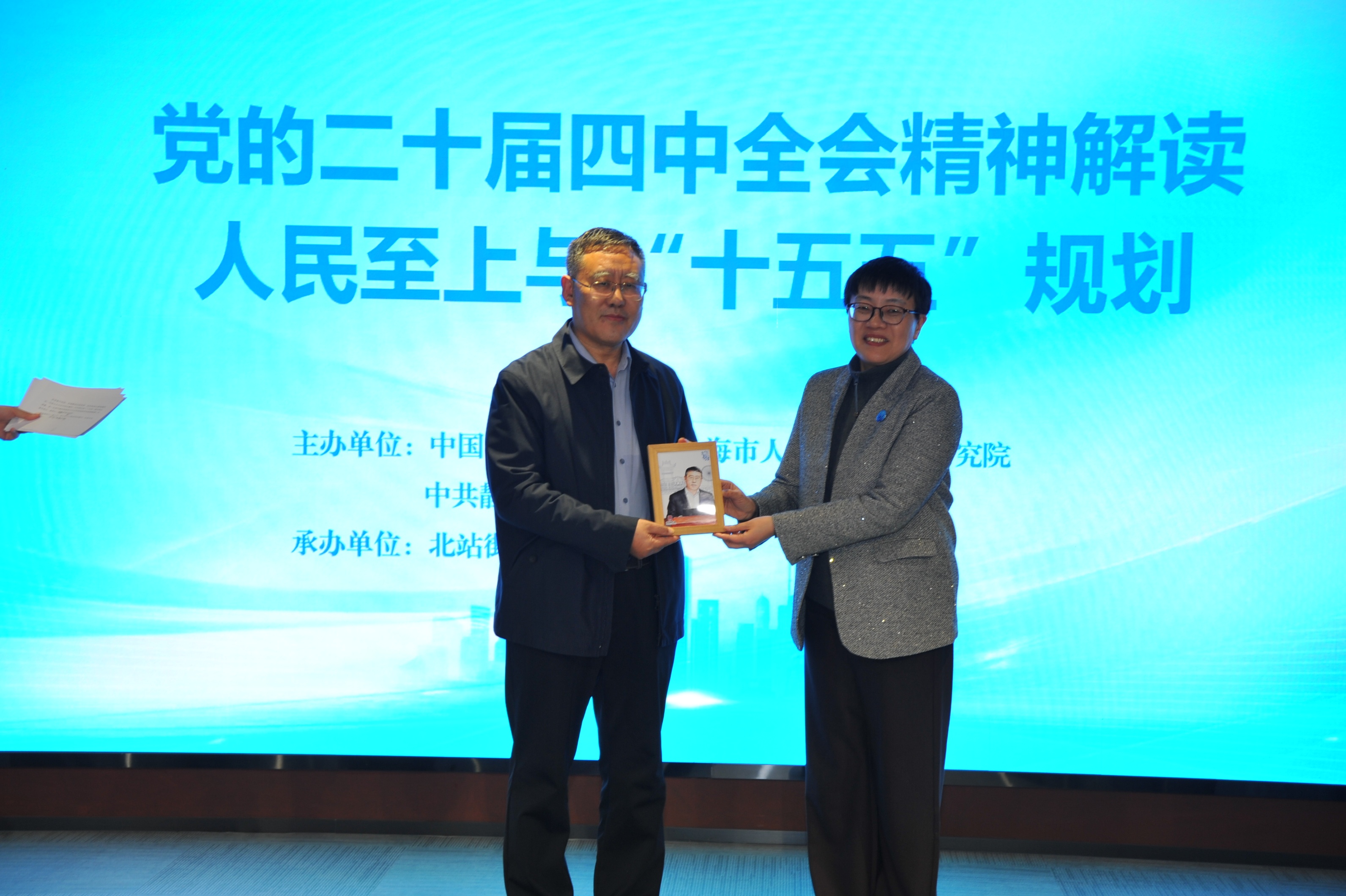 本次活动由中国社会科学院—上海市人民政府上海研究院、中共静安区委宣传部联合举办,北站街道党工委承办。特别邀请辛向阳作《党的二十届四中全会精神解读,人民至上与“十五五”规划》专题讲座,并向他赠送一幅独具匠心的定制画像和《阅读苏河左岸》一书。