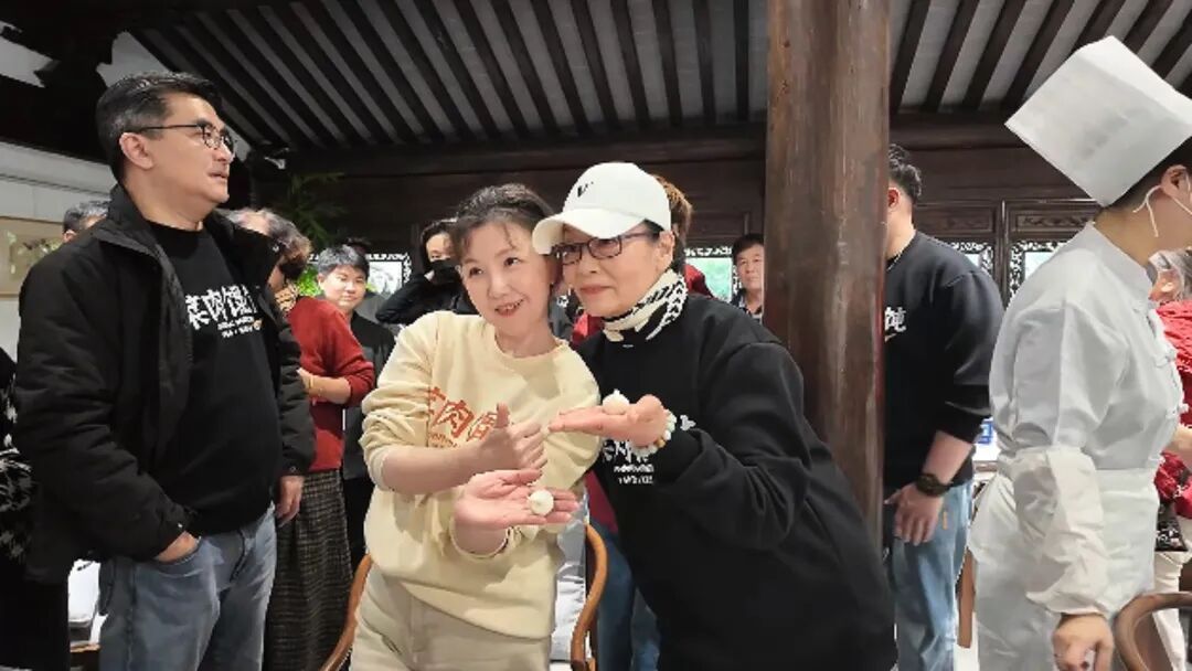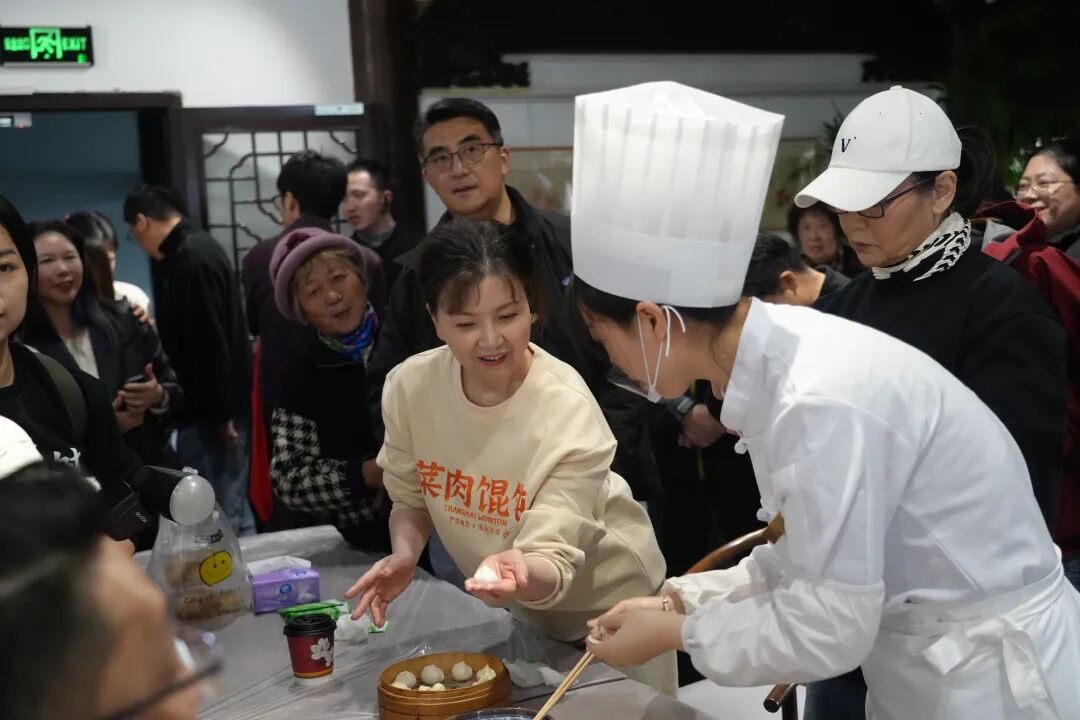 包出一个标准的南翔小笼,可一点也不简单,每张面皮精准到厚1.5毫米、重8克,包入16克馅料并捏出18道以上折褶。主创与市民共同化身“点心学徒”,抄起筷子和肉泥,在小笼师傅的指导下,亲手完成擀皮、包馅、收口等一系列步骤。