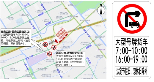 二、自2025年12月9日零时起,G1503嘉松北路南收费站口每日7:00至10:00、16:00至19:00(法定节假日,双休日除外)禁止大型号牌货运车由西向北左转上高速。