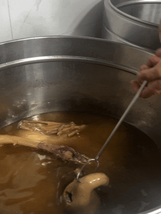 卤鹅是店里的招牌,所用的鹅均来自自家的养殖场,从汕头空运到店。精选一年以上、体重在12至17斤的狮头鹅,此时的鹅肉肥瘦得宜,肉质紧实且富含油脂香。为了这一锅卤香,店内每天早晨6点就开始忙碌起来。处理、配料、备卤、吊汤……其中最关键的是对火候的控制,火太大会带走老汤里的香味,火太小又卤不透,所以要温火慢卤,翻转多次吊汤,让每个部位都受热均匀,才能保证每一块鹅肉的鲜香味美。