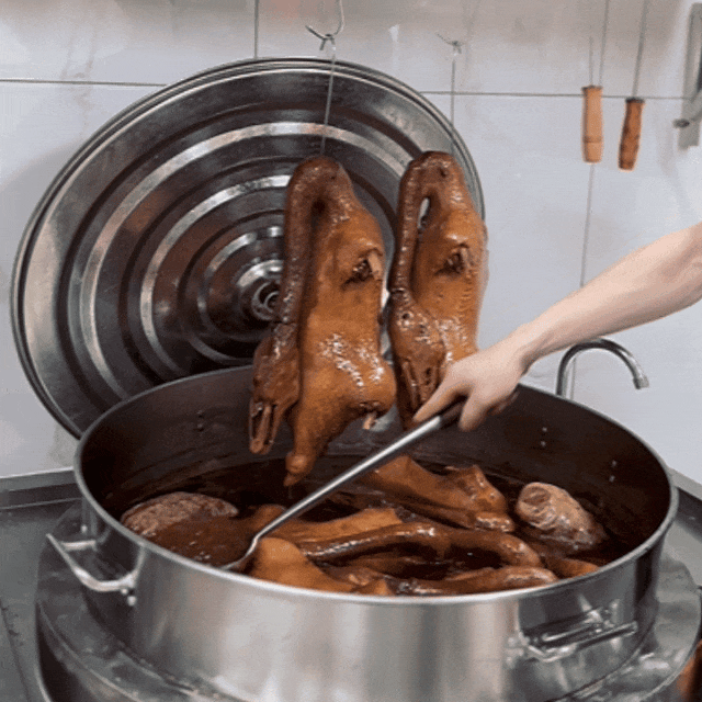 据介绍,味德丰的古法五道酱鹅,严选100天以上生态大白鹅,一锅只煮5只。经过“洗、腌、醒、烹、熬”五道传统工艺,经过三百多勺的反复浇汁,方能保证酱鹅色泽红润,酱香浓郁。表皮鲜甜香滑,肉质饱满鲜美多汁。