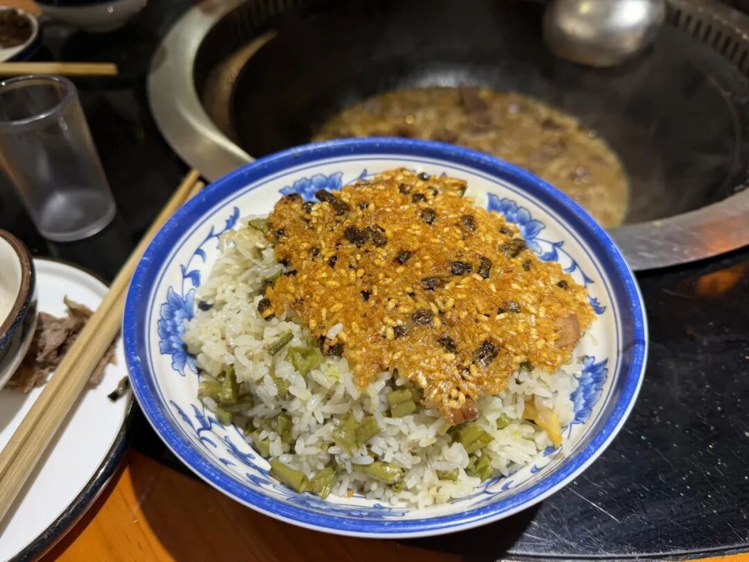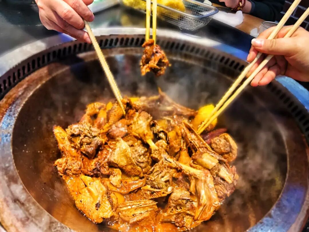 锅开盖时蒸汽升腾,贴上来自苏北的玉米面饼,粗粮的香甜吸饱汤汁,瞬间将乡野的烟火气推向极致。待鹅肉享尽,务必再吃上一碗缸豆锅巴饭,米粒与焦香交融,那真的是香!