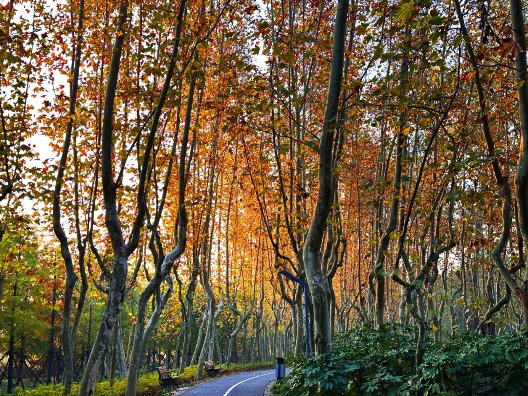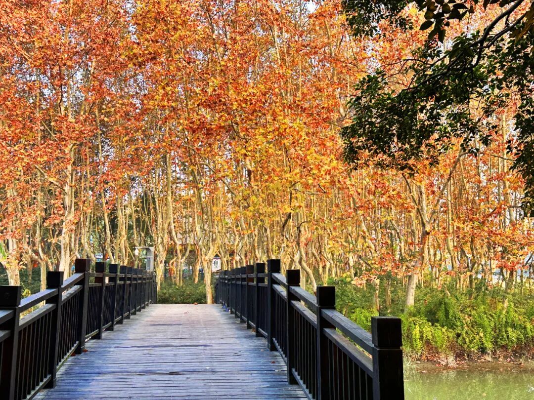 这里的悬铃木大多树龄超30年,它们是黎安公园的灵魂。其种植面积占园区绿化总面积的65%,成年树木错落排布,高高的树干撑起绵长的天然穹顶。抚摸粗糙的树皮,如触到四季的纹路;张望穿云的叶片,似看到故乡的炊烟。成排成行的悬铃木,组成威武的卫士,见证着闵行从工业大区到生态城区的蜕变,如今正用最盛大的秋景,回报这片丰稔土地的滋养。