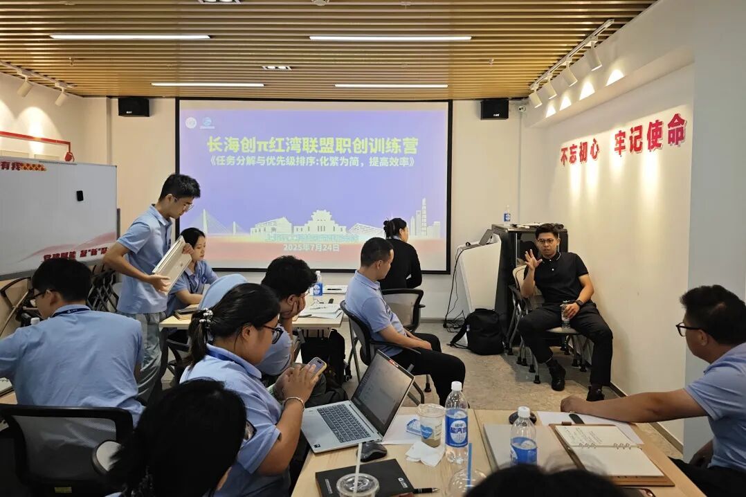 答案在于强化党建引领。街道党工委立足人民城市理念,以党建为纽带,将分散的资源整合起来,于是“长海创π红湾联盟”应运而生。“创”字当头,代表创新创业就业的核心使命;“π”象征着科技多元的无限延伸与团队协作;“红”彰显党的全面领导;“湾”则寓意着资源如百川汇海,凝聚合力。这个依托“长海红湾”党建品牌建立的新平台,旨在构建一个全链条的就业创业赋能体系。