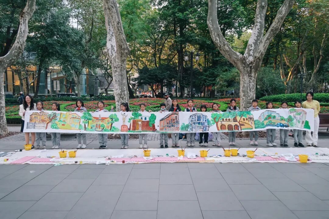 市集的热闹之外,一场文艺气息十足的绘画活动同步上演。来自位育实验学校四年级和五年级的16名学生大展身手,在上海民盟书画院画师、上海梧桐画社画师邬海佳和学校美术老师指导下,开展“画笔述方志・共绘红色文化历史长卷”活动。