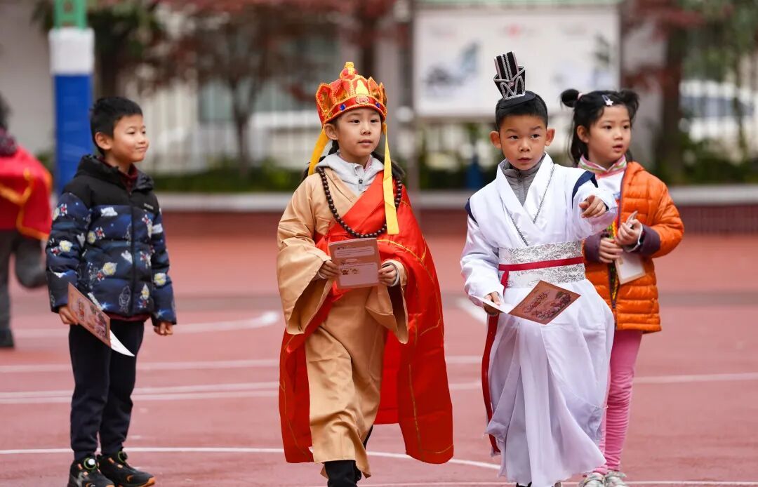 孙悟空、唐僧、铁扇公主、猪八戒……12月5日上午,黄浦区海华小学的操场瞬间“变身”热热闹闹的“西游记主题乐园”,孩子们装扮成《西游记》里的各色人物,开启了奇妙的闯关之旅——这是该校以“书香作伴‘趣’西游”为主题的奇思妙想主题日之读书节活动现场,师生在轻松愉悦的氛围中沉浸式地感受经典文学的魅力。