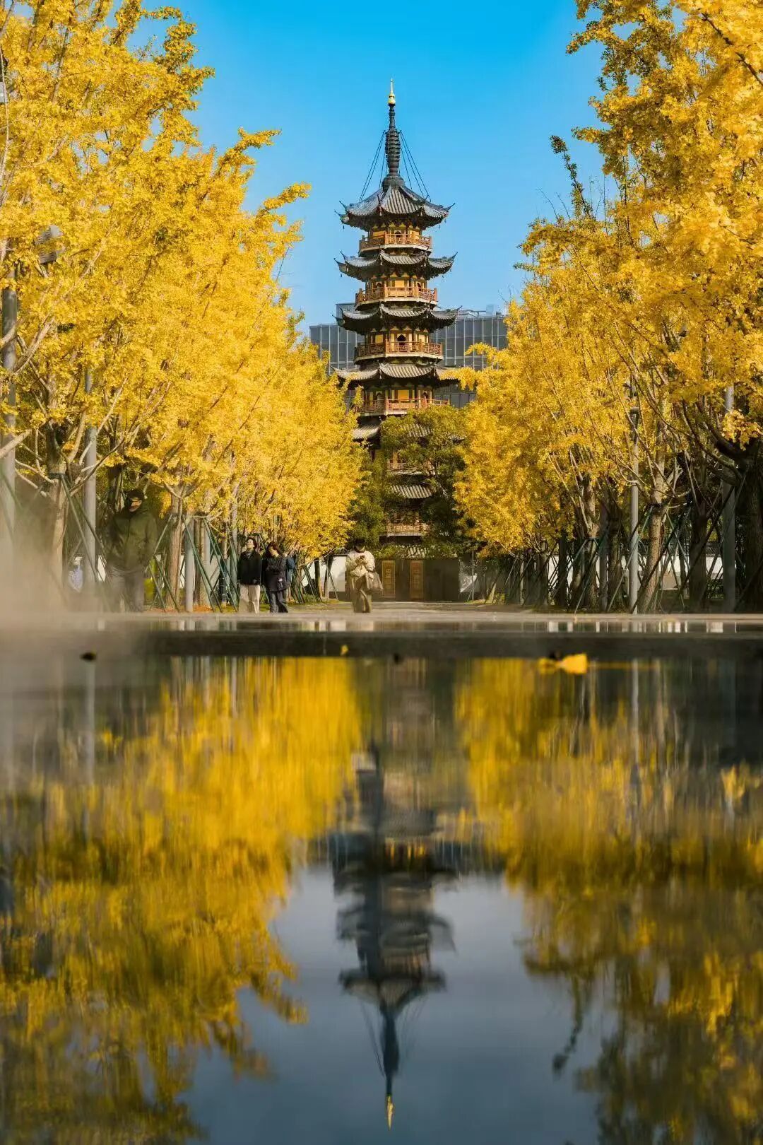 银杏大道位于龙华寺的广场前,两排满满的银杏树,可拍摄到与龙华塔同框的绝美画面。