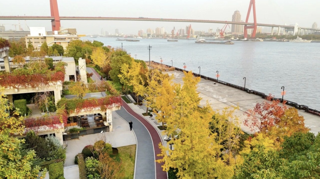 沿着Z字形的坡道缓缓而上,一侧是锈红色的工业遗存,另一侧是金叶摇曳的银杏,远眺则是浦江两岸的现代化景致。