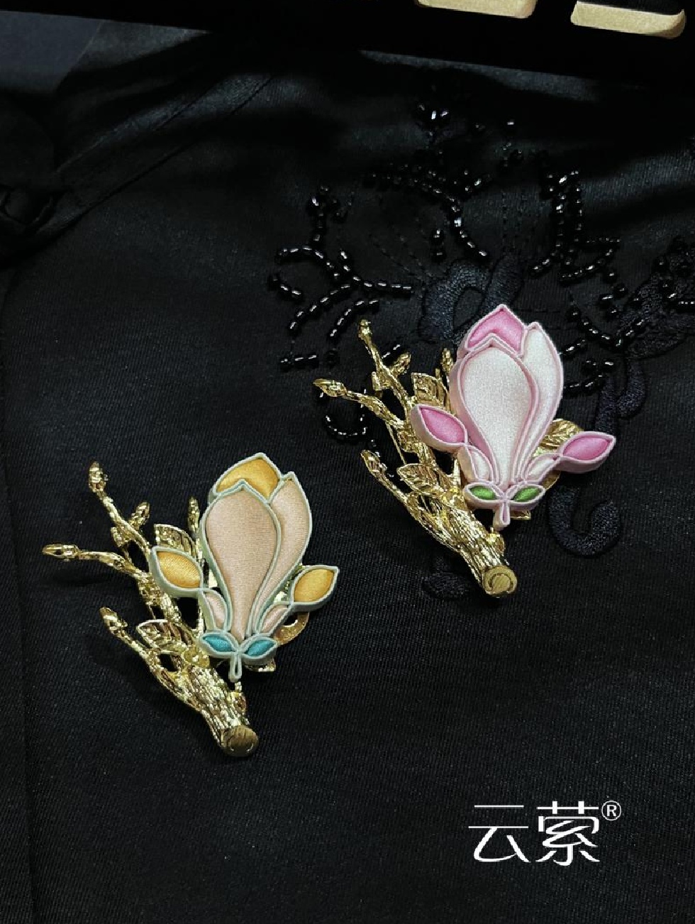 “爱上海”白玉兰盘扣胸针以市花白玉兰为原型,纯手工打造,并搭配现代金属配饰,传递奋发向上的城市精神,曾入围2024中国特色旅游商品大赛。