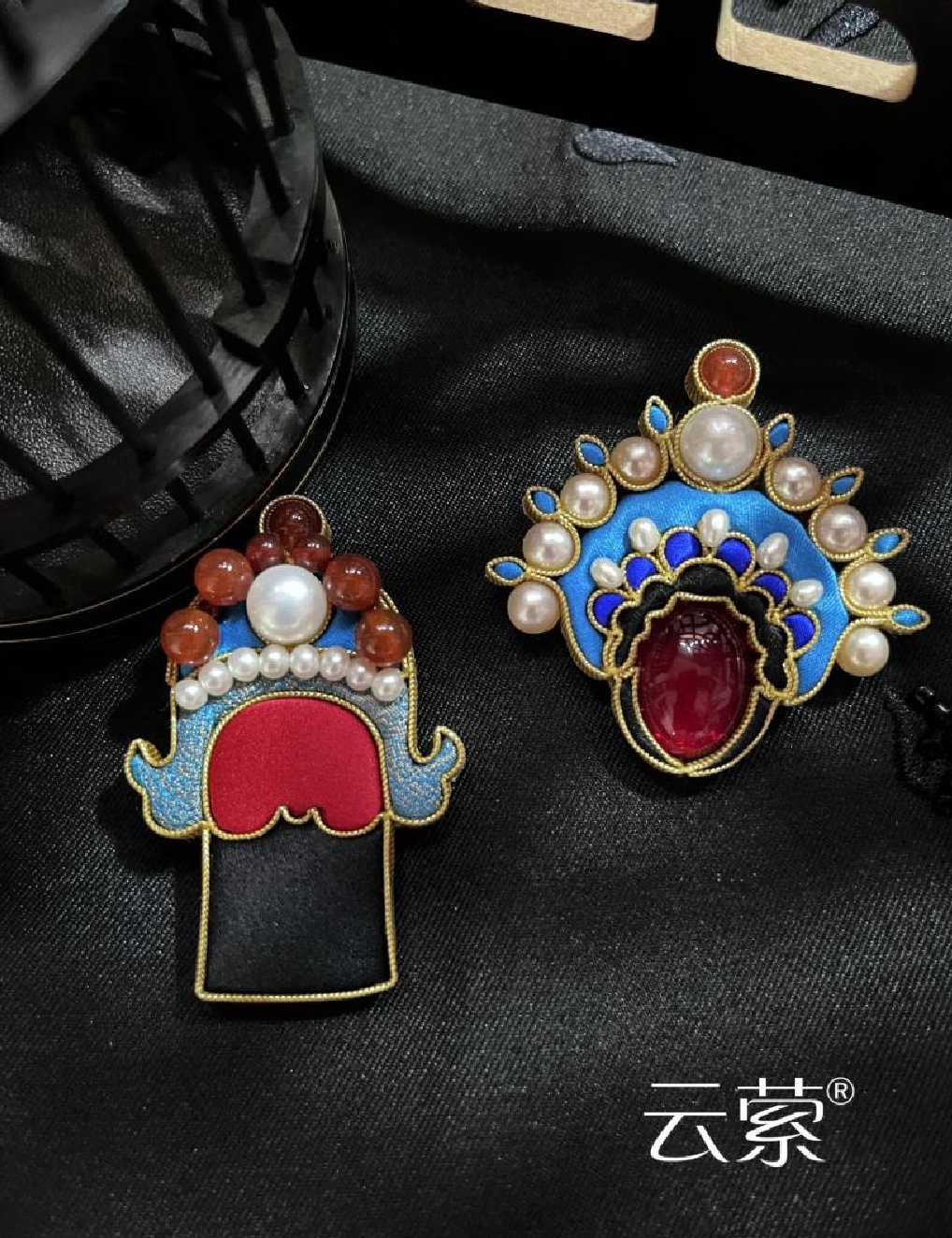 “国粹”盘扣胸针系列融合京剧与盘扣双非遗,创新加入珠宝镶嵌工艺,斩获多项国潮文创大奖。
