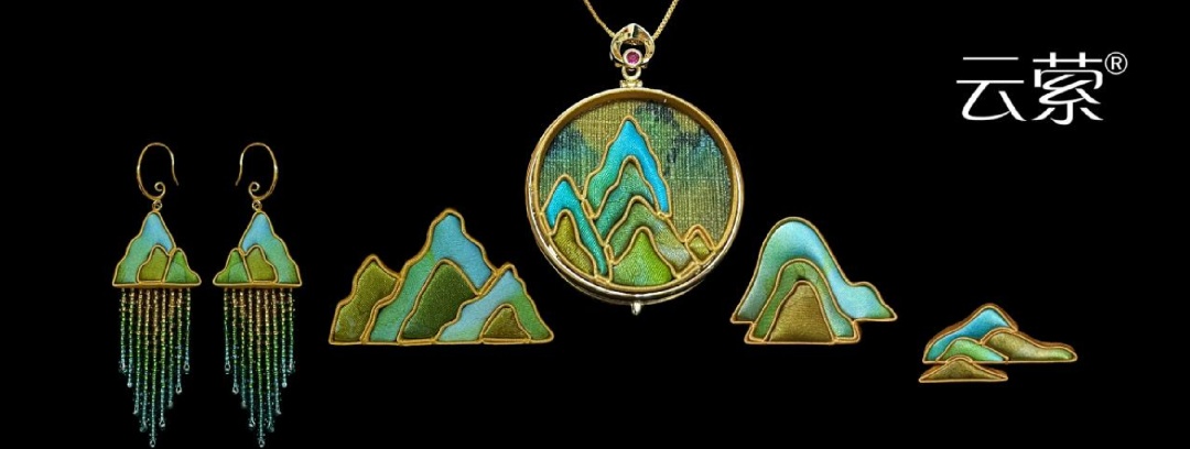 “千里江山”盘扣饰品礼盒系列取材北宋名画,运用“俏色塞芯”等创新技法还原青绿山水意境,搭配金银花丝、串珠等工艺及香道文化,囊括中国旅游商品大赛银奖等多项荣誉。
