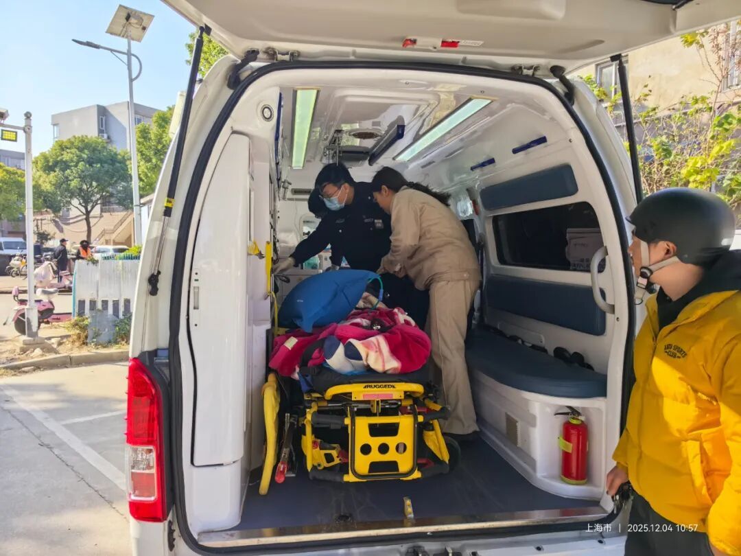 进门后,众人发现王师傅躺在床上意识模糊,口角微歪,无法正常言语,疑似突发中风。民警立即拨打120急救电话,居委会工作人员在旁持续观察其状态,不断轻声呼唤与其交流,同时迅速联系其在沪家属告知情况。120急救人员抵达后,现场对王师傅进行了诊断,并在大家合力协助下,迅速将他抬上担架送往医院救治。