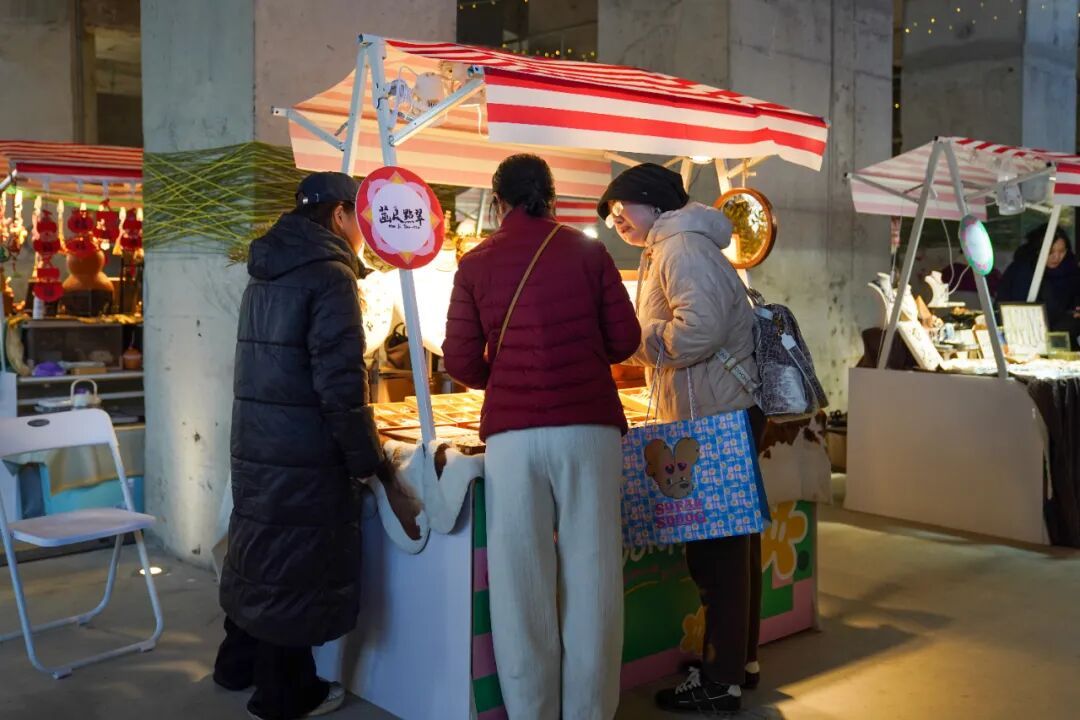 与户外冰场的动感活力相得益彰,南区大筒仓下的万花筒仓市集则为市民提供了慢享时光的休闲空间。作为对工业遗存的创新利用,这场以“万花筒”为灵感的主题市集,汇集了鲜花绿植、花艺文创、宠物用品等20余个特色摊位,不设固定动线的开放式布局,让市民可以随心漫步,邂逅惊喜。