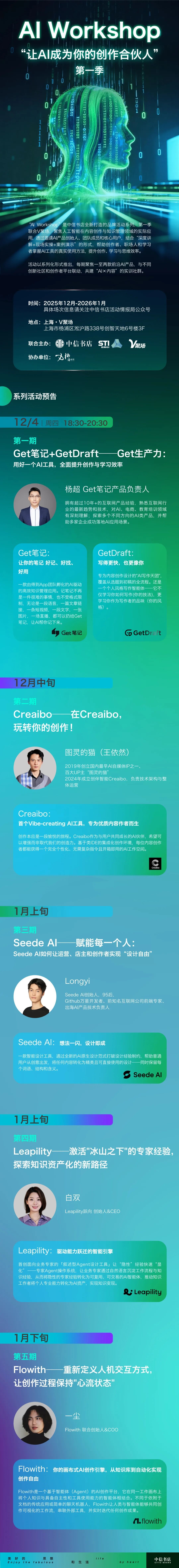“AI技术正在从根本上改变知识的生产方式,但我们发现,大多数内容创作者、知识工作者对于AI工具还停留在‘尝试’阶段,不知道如何将它融入日常工作流程。”系列活动相关负责人介绍道,“我们希望带来系统化的实战课程,推动知识生产方式的实质性变革。”