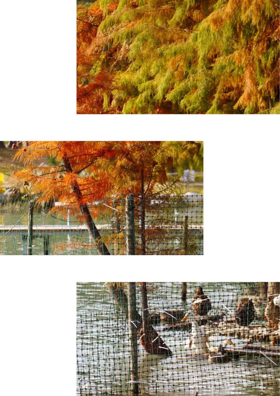 几棵枫树立在水中鸭群在圈定的水域悠荡。