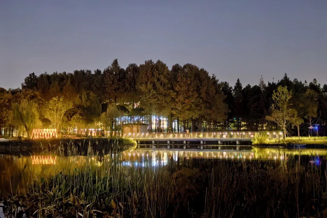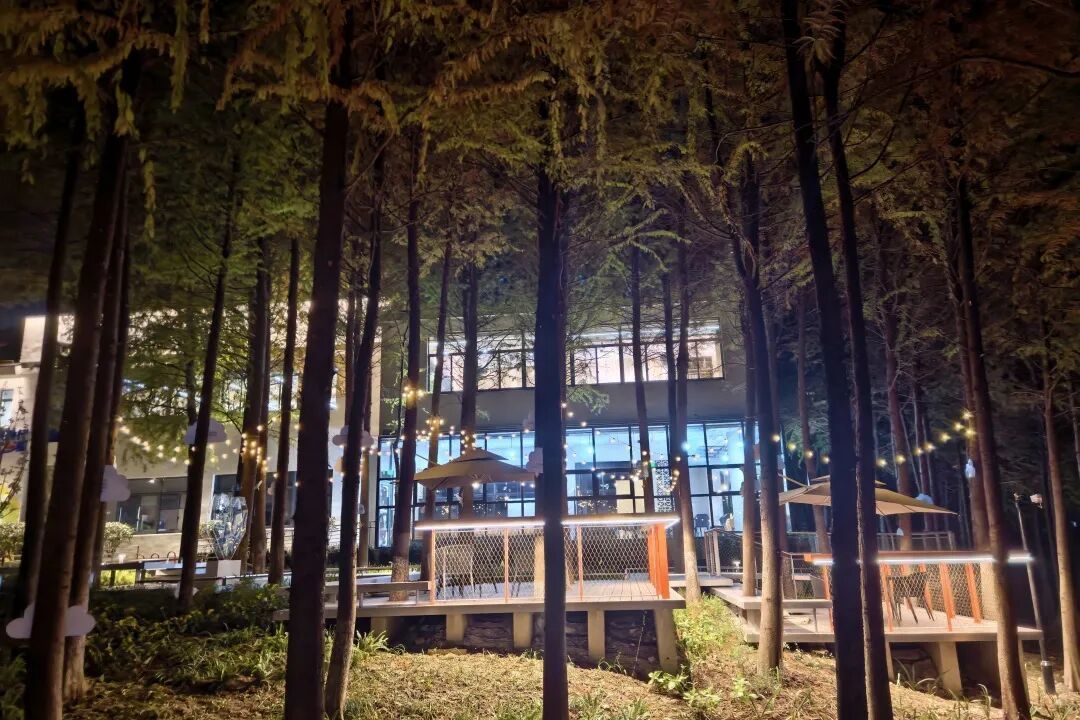 当你沿着公园跑道散步,这些焕新的细节会一一展现在眼前。“蒲公英灯”在绿意间轻轻点亮,园区企业标识、齿轮建筑、航天主题彩绘等创意装置也在沿途不断映入眼帘。顺着步道继续前行,还会来到一个新开辟的“露天咖啡吧”。这里原本是一片草坪,如今通过新建步道、增设户外设施,与莘庄工业区光华党群服务中心串联成片。