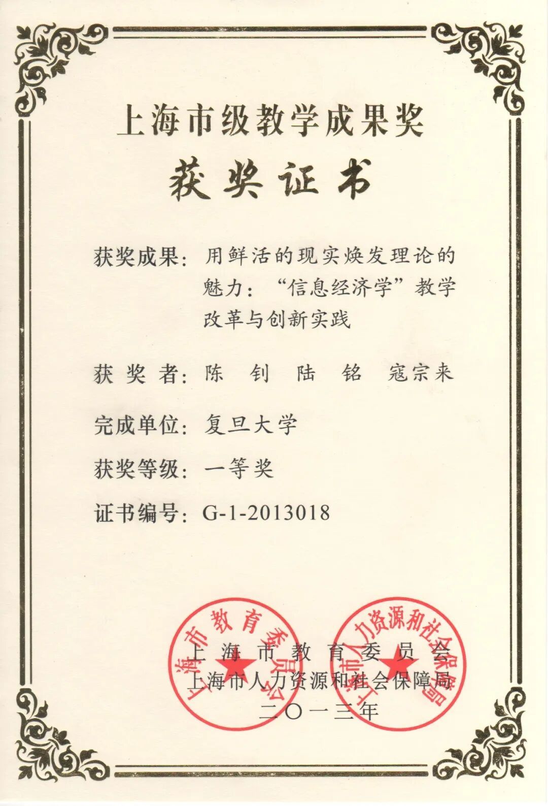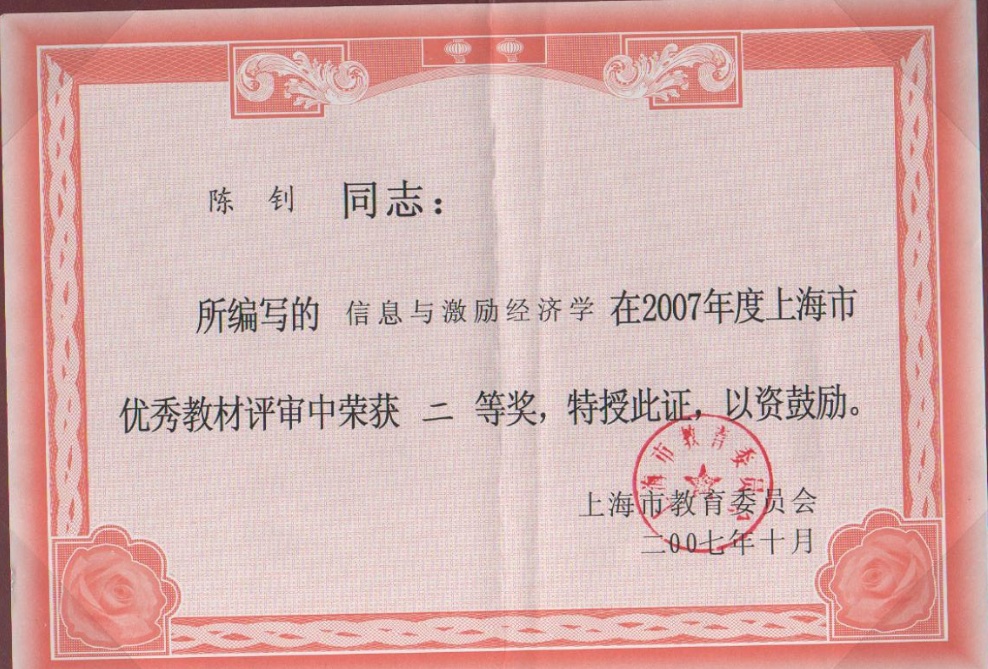 《信息与激励经济学》获“上海市高校优秀教材二等奖”证书