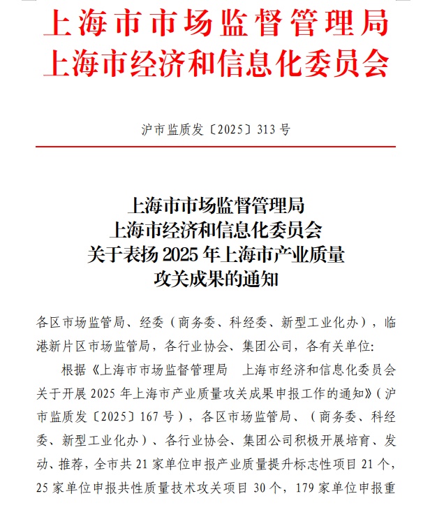 近日,《关于表扬2025年上海市产业质量攻关成果的通知》正式发布。金山区4家企业荣获“2025年重点产品质量攻关项目成果奖”,金山区市场监督管理局获评“2025年上海市产业质量攻关优秀组织单位”。