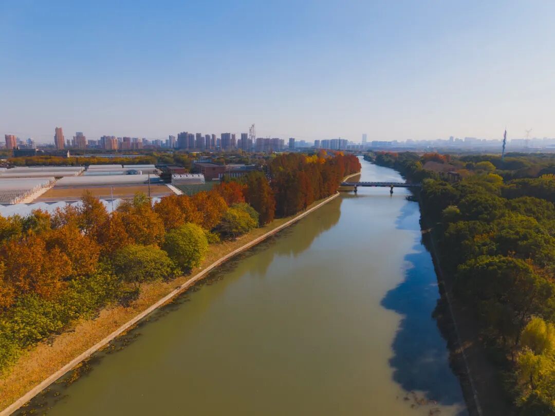 在嘉北郊野公园1号门前,近500米长的杉林已褪去夏日的青翠,代之以金黄、橙红与深棕交织的暖色。这片绵延的彩林与一旁静静流淌的河道相映成趣,斑斓树影倒映水中,构成一幅视野开阔、意境宁静的初冬长卷。