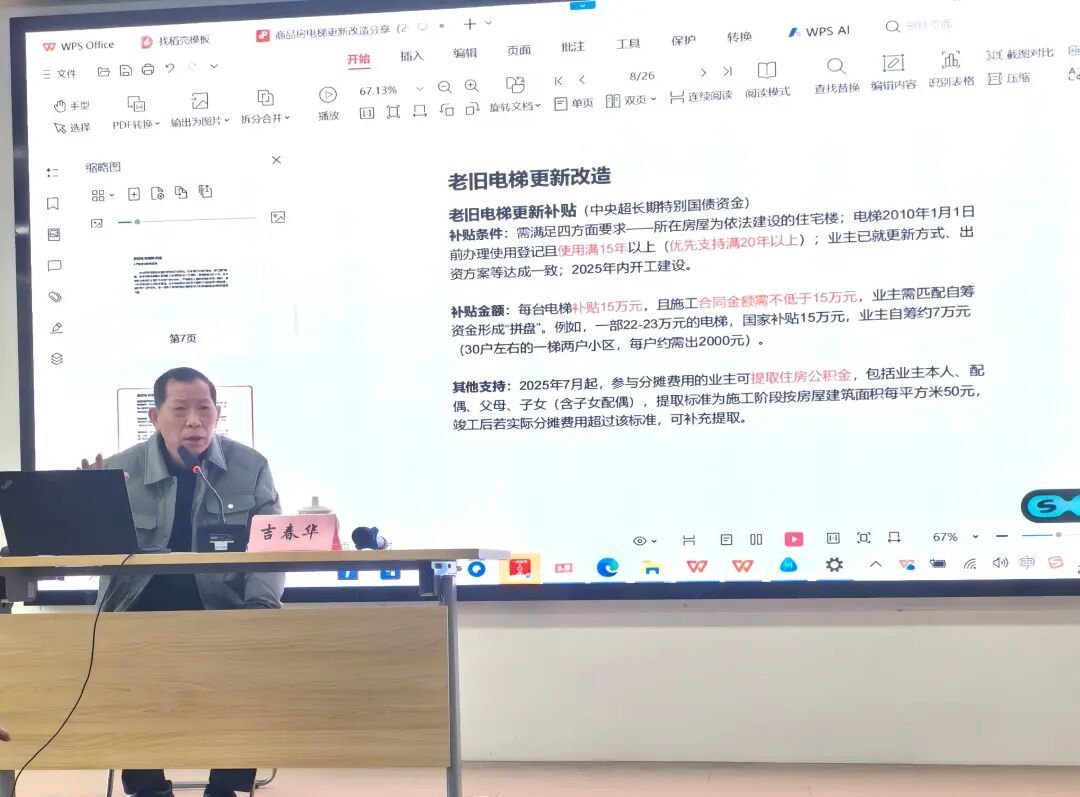 本次培训聚焦住宅小区电梯维修、更新与改造实务,特邀资深业委会主任吉春华担任主讲。凭借丰富的实践经验,吉春华系统解读了《关于进一步加强既有住宅电梯使用安全管理工作的实施方案》等政策文件,详细阐述了电梯安全评估制度、更新改造流程及经费保障政策。
